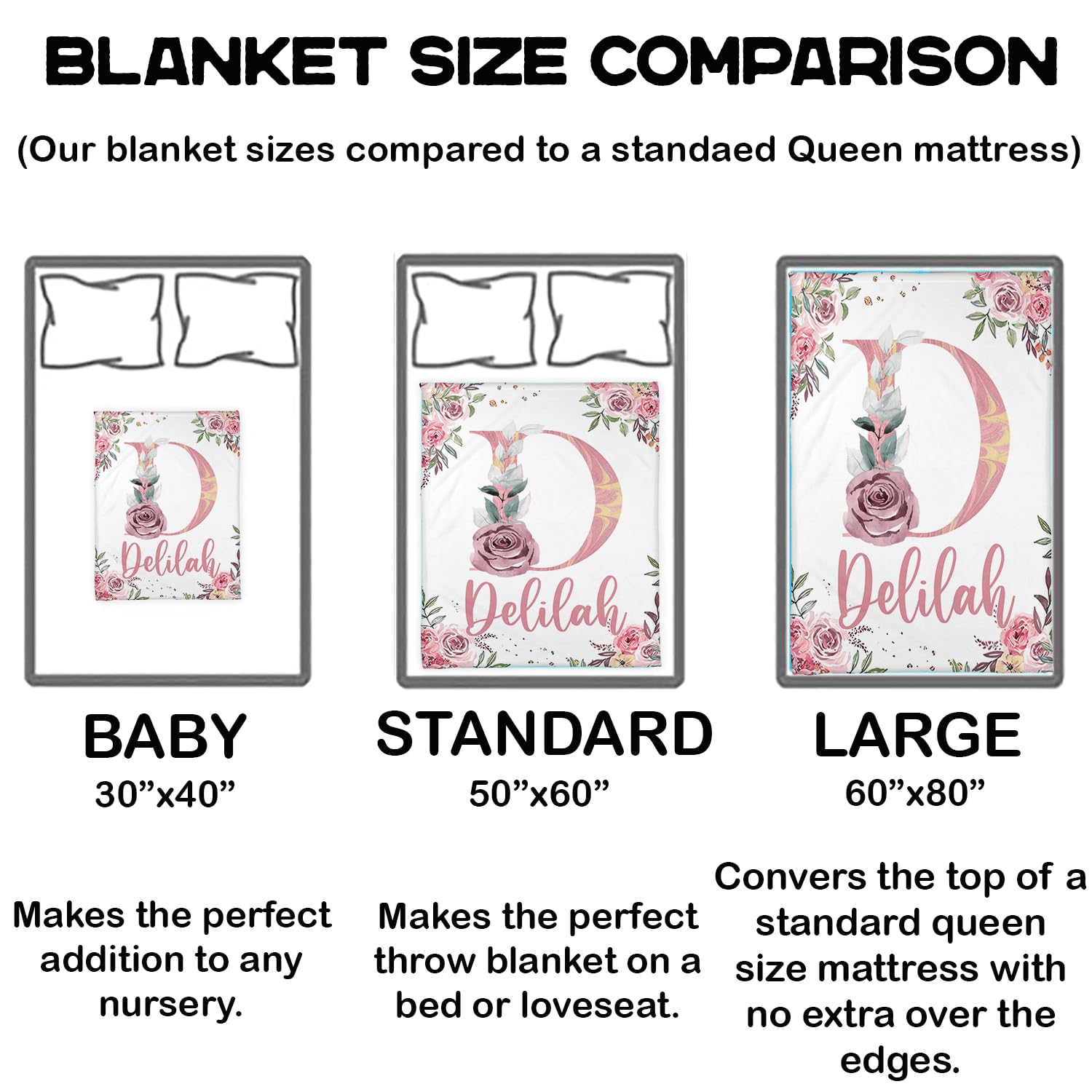 Are you looking for a blanket that can keep good memories? This carefully prepared customized blanket with memories is a perfect gift for adults, children, family, friends, pets, mothers, fathers, boyfriends, girlfriends, daughters, sons, grandmothers, grandfathers, wives, husbands, sisters and partners Note: 1. This blanket is printed on one side, and the unprinted side is white; 2. If necessary, we will help you adjust your name to achieve the best results. In order to make the goods reach you faster, when we receive your order, we will immediately arrange production。 If there is any problem with your order, please let us know. Thank you for coming! Personalized Custom Gift Blanket You can add the name (text) you need on the blanket and give it to your baby, family, lover, friend or pet or keep it for yourself. This is a very meaningful gift, we have designed it for you with the fonts and colors you need, it looks great Personalized Gift - newborn gift - birthday gift - kids gift - holiday gift Soft and Light Name Blanket Perfect for babies, adults or pets, this soft and lightweight custom blanket will keep you warm anytime. Can be used as a baby swaddle blanket, crib blanket or baby crawling blanket, can also be your sleeping blanket, sofa blanket, travel blanket, cute prints will not affect the softness of the blanket