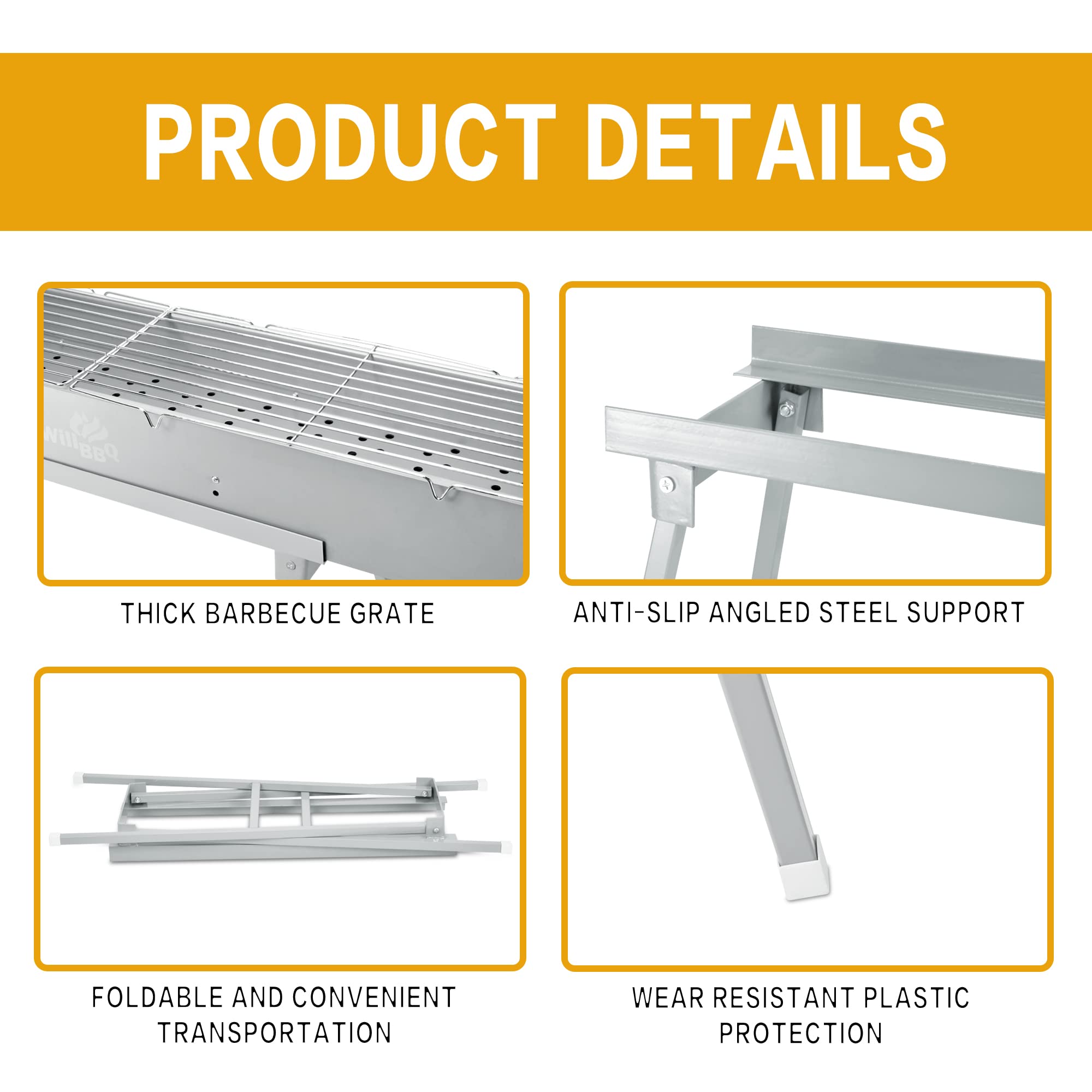 Wide Application:The charcoal grills are perfect for any Skewers, Shish Kebab, Lamb Kebab, Shashlik, Japanese yakitori grill, Malaysian Satay, Thai Satay,Chinese Lamb Skewer and all other steaks, fish and vegetables, etc.Suitable for outdoor smoked cooking, picnics, tailgating, camping grill or on the patio,backyard, garden, traveling, park, beach.