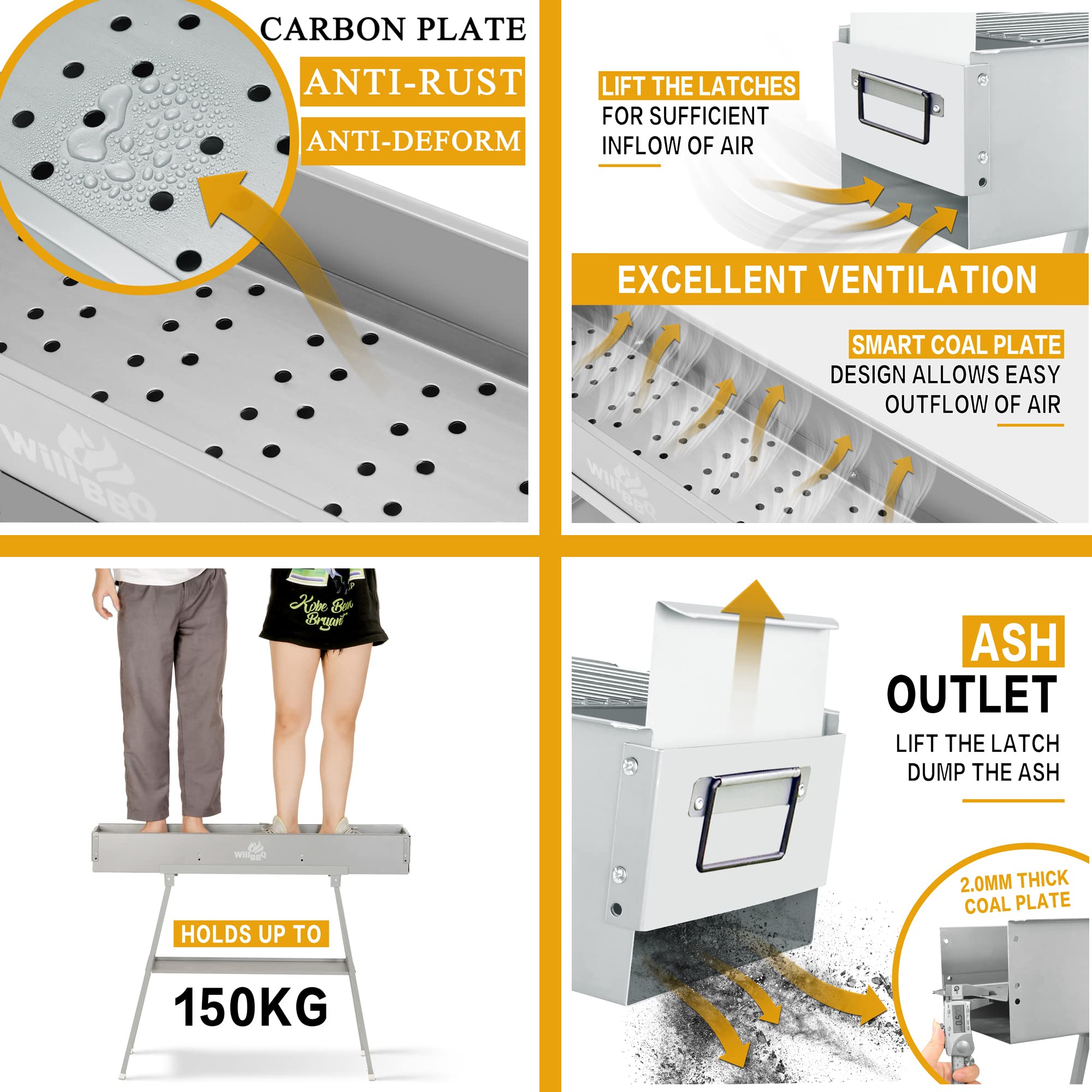 Foldable and Portable,Strong and High Temperature Resistant:Strong solid body made of alloy steel with 2mm thick coalplate, Steady foldable stand holds up to 150KG.Stand of the barbecue grill is designed to be foldable, you can have the bbq grill anywhere you would like to set up.Handles on both sides also help you move the camping grill with ease.
