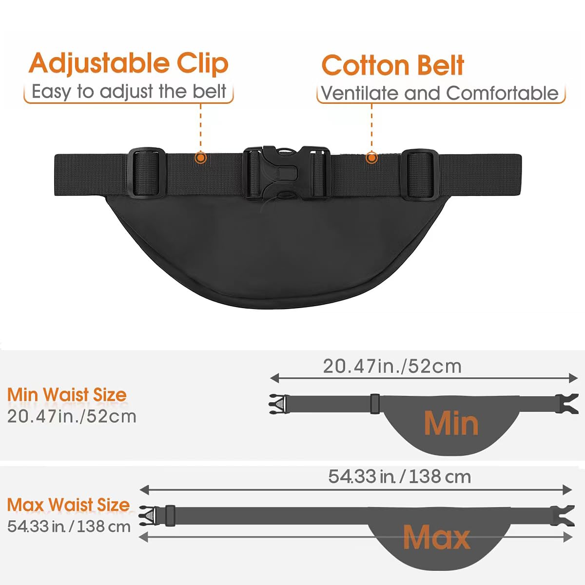 【Adjustable large capacity fanny pack with extended belt packed in the front pocket】This cool Waist Bag Pack for women men can be adjust widely with waist range from 52cm to 138cm(20.47-54.33 Inches),easy to adjust the length of Belt bag as your request by the quick release buckle,you can wear this fanny pack in front of your waist,back on your hip,over the shoulder or under your arm.