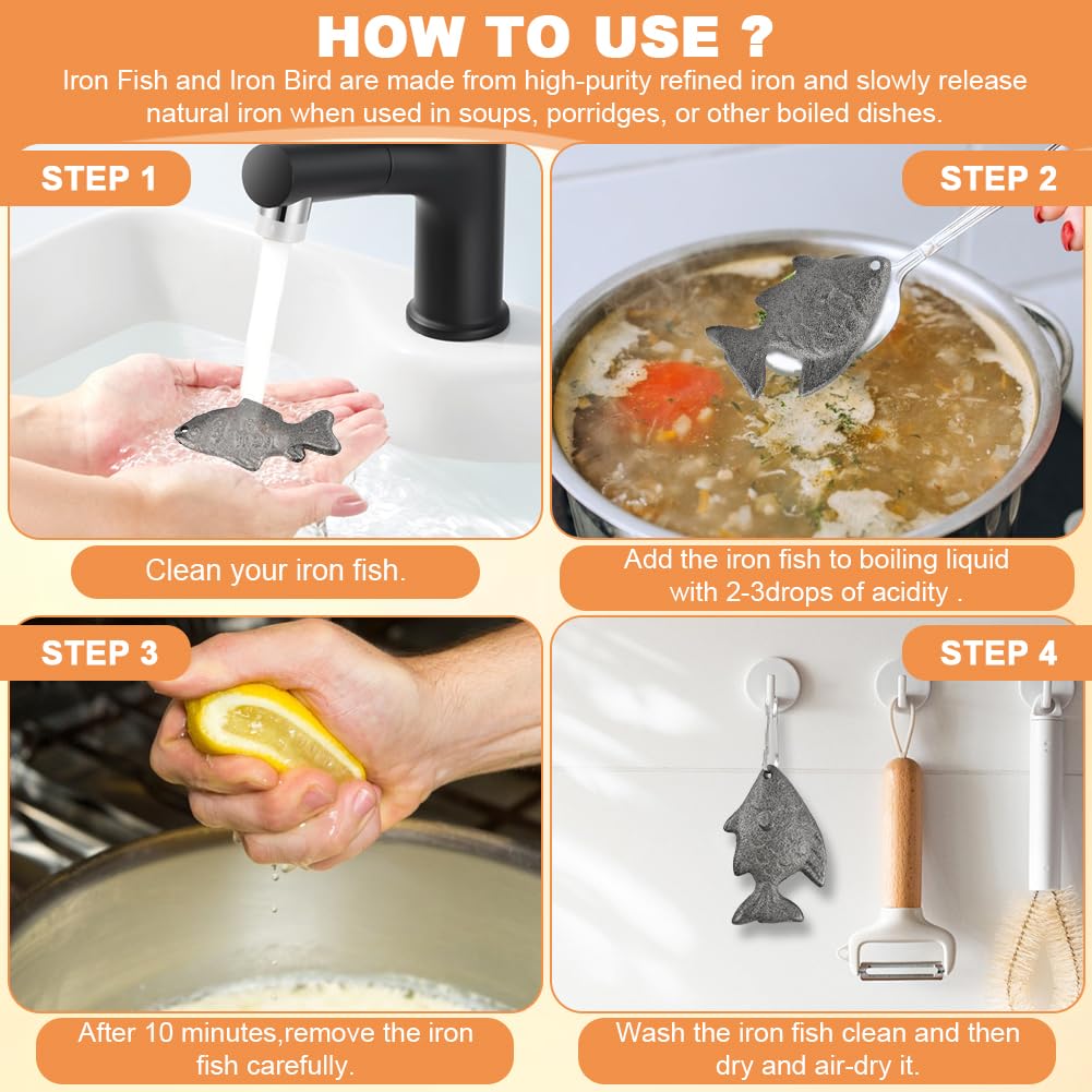 Natural iron source: Iron Fish and Iron Bird are made from high-purity iron. When cooking soup, porridge or other boiled foods, they will slowly release natural iron. This is a direct dietary approach designed to help you easily supplement iron through daily cooking.