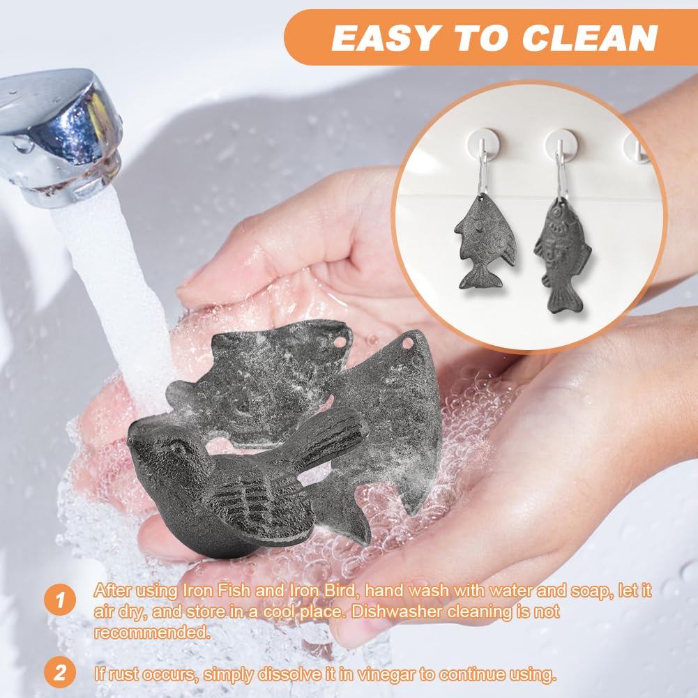 Reusability: Iron fish and iron birds can be reused for a long time. Just clean it thoroughly, dry it completely, and then hang it in a dry place. Precautions for use: After using the iron fish, please hand wash it with water and soap, dry it and store it in the refrigerator. It is not recommended to clean in a dishwasher. If it rusts, just dissolve it in vinegar and continue to use it.