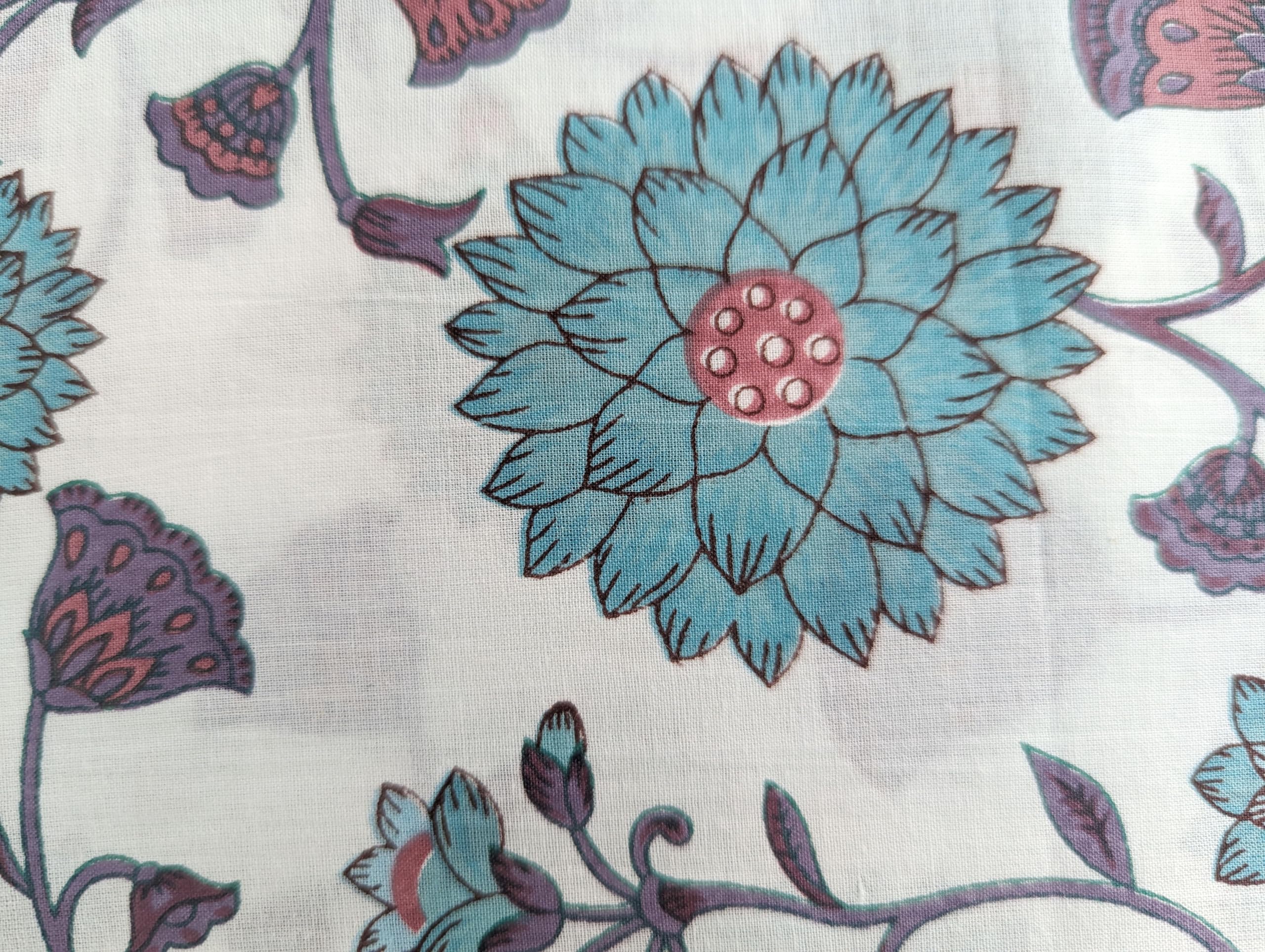 This is a hand printed fabric using wooden blocks or screens.