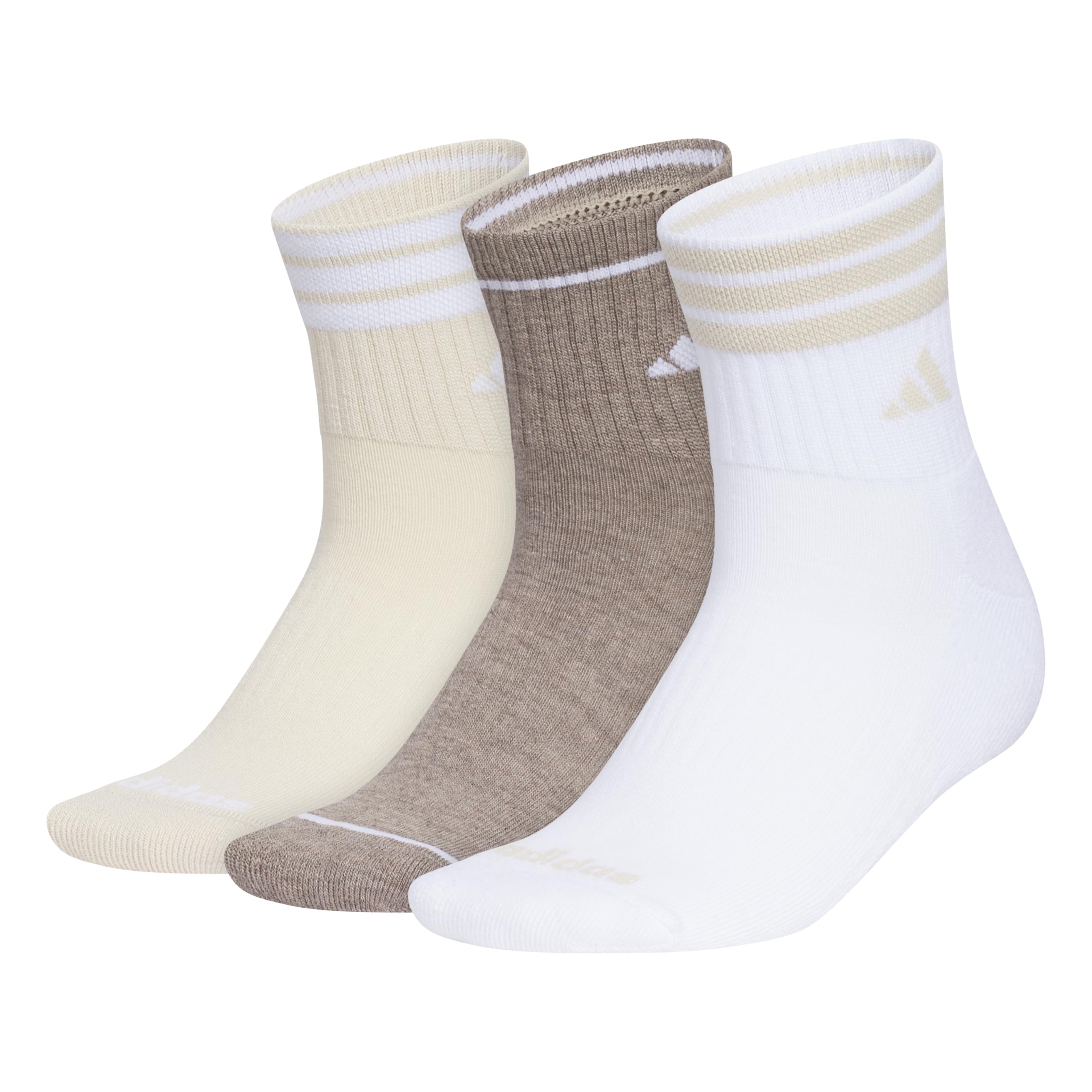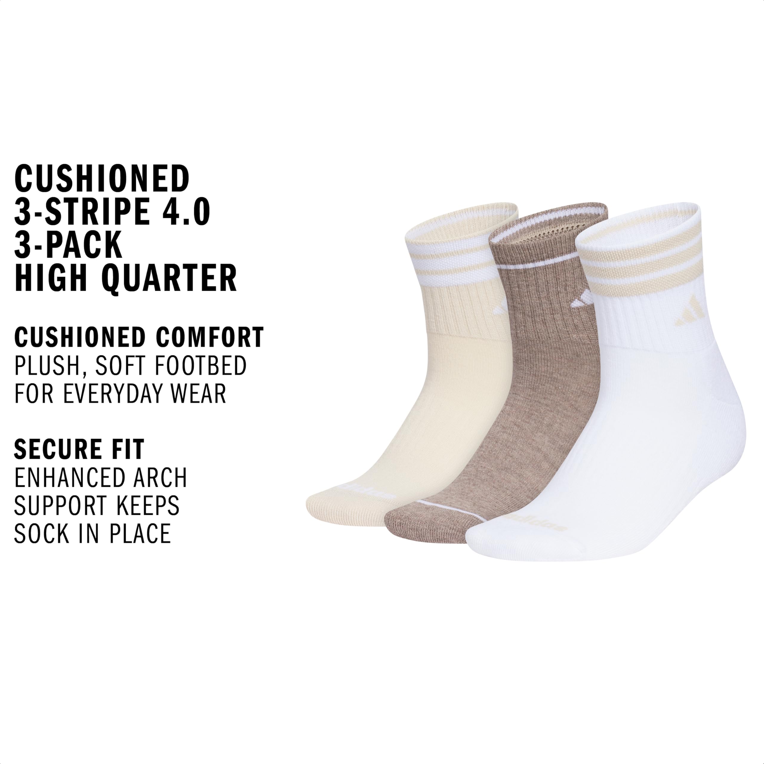 Description These women's cushioned quarter-high socks go long on comfort. Thoughtful details like extra arch support and moisture-wicking yarns help you power through your personal records. Simple adidas logos root your style in sport. Includes three pairs, so you have options.