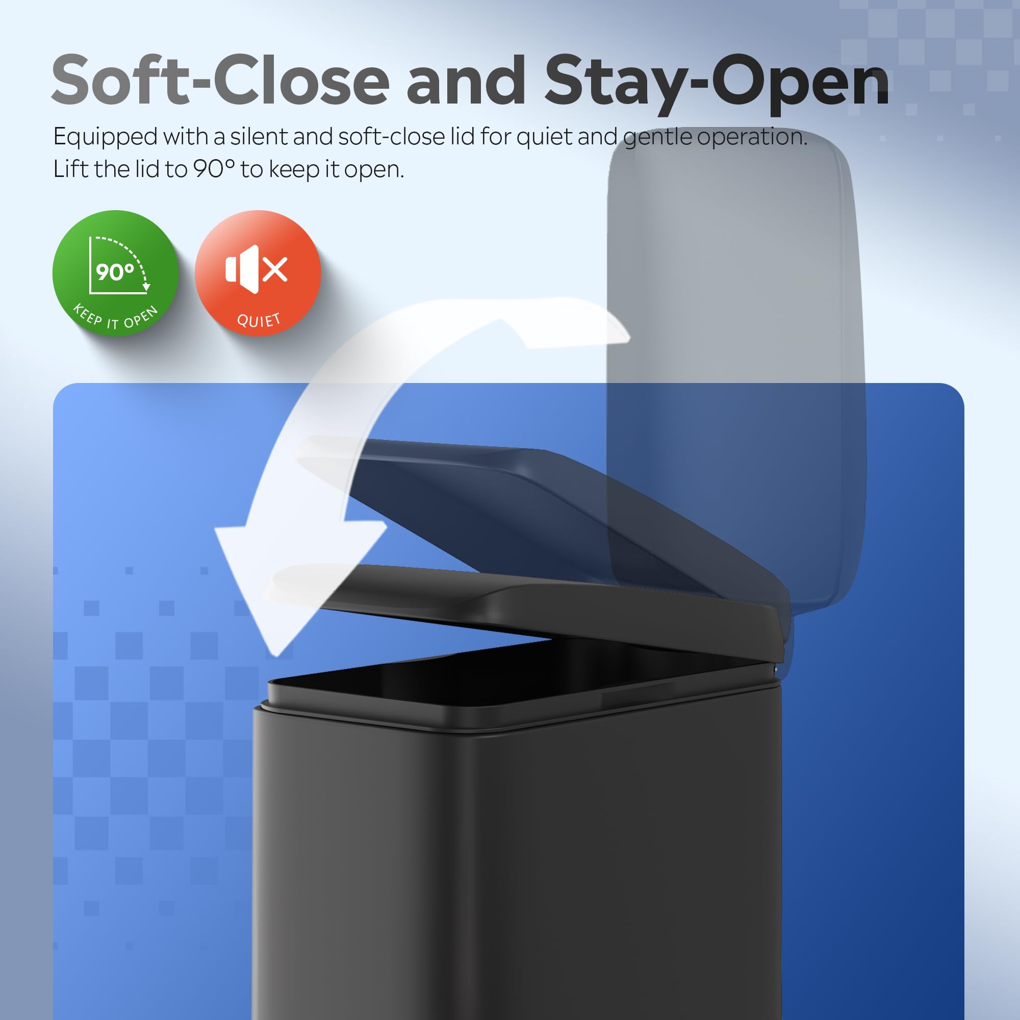 【Quiet-Close Bathroom Garbage Can】 Equipped with a soft-close lid, this stainless steel trash can closes quietly and gently. It prevents slamming, reduces noise disruption, and protects the lid and body from wear.