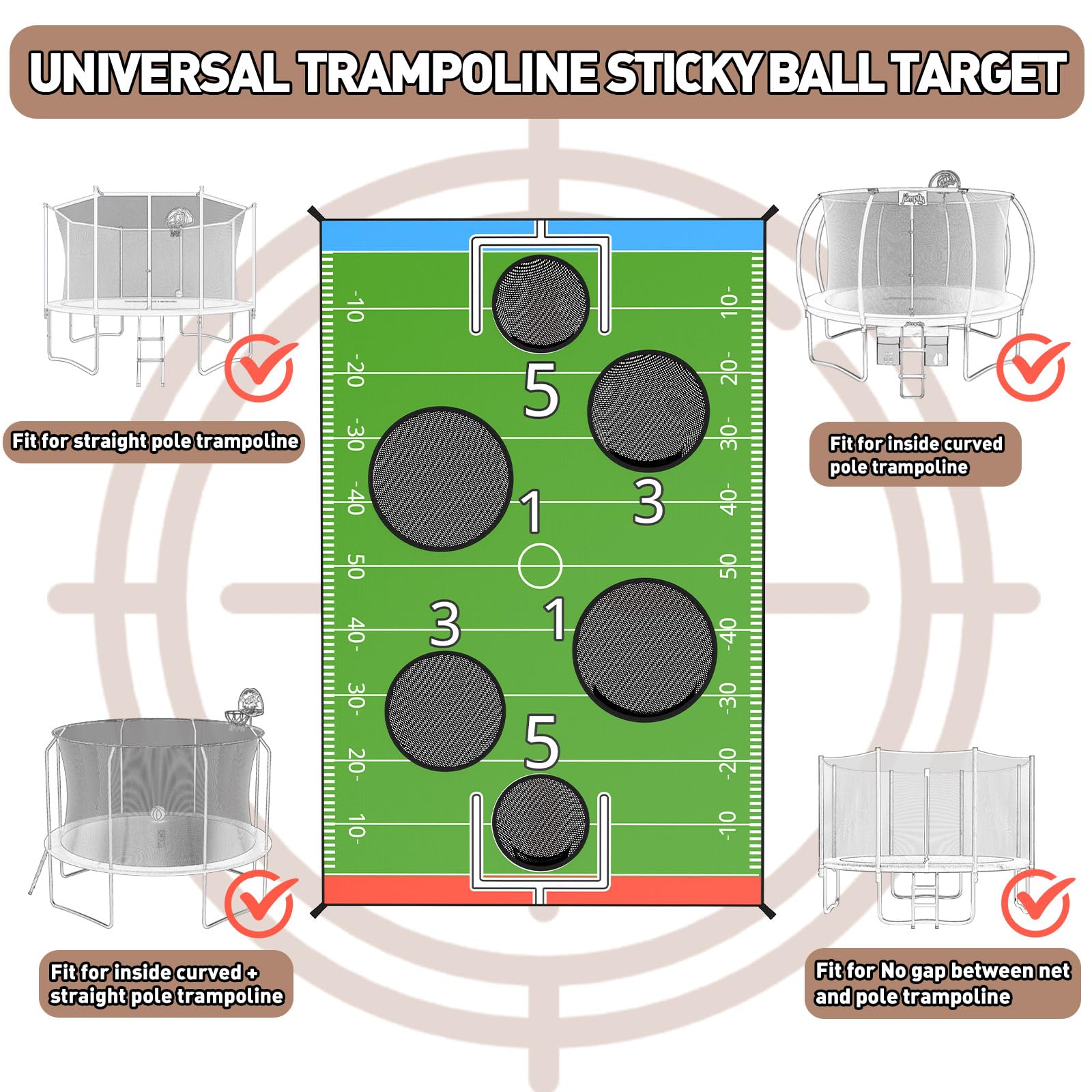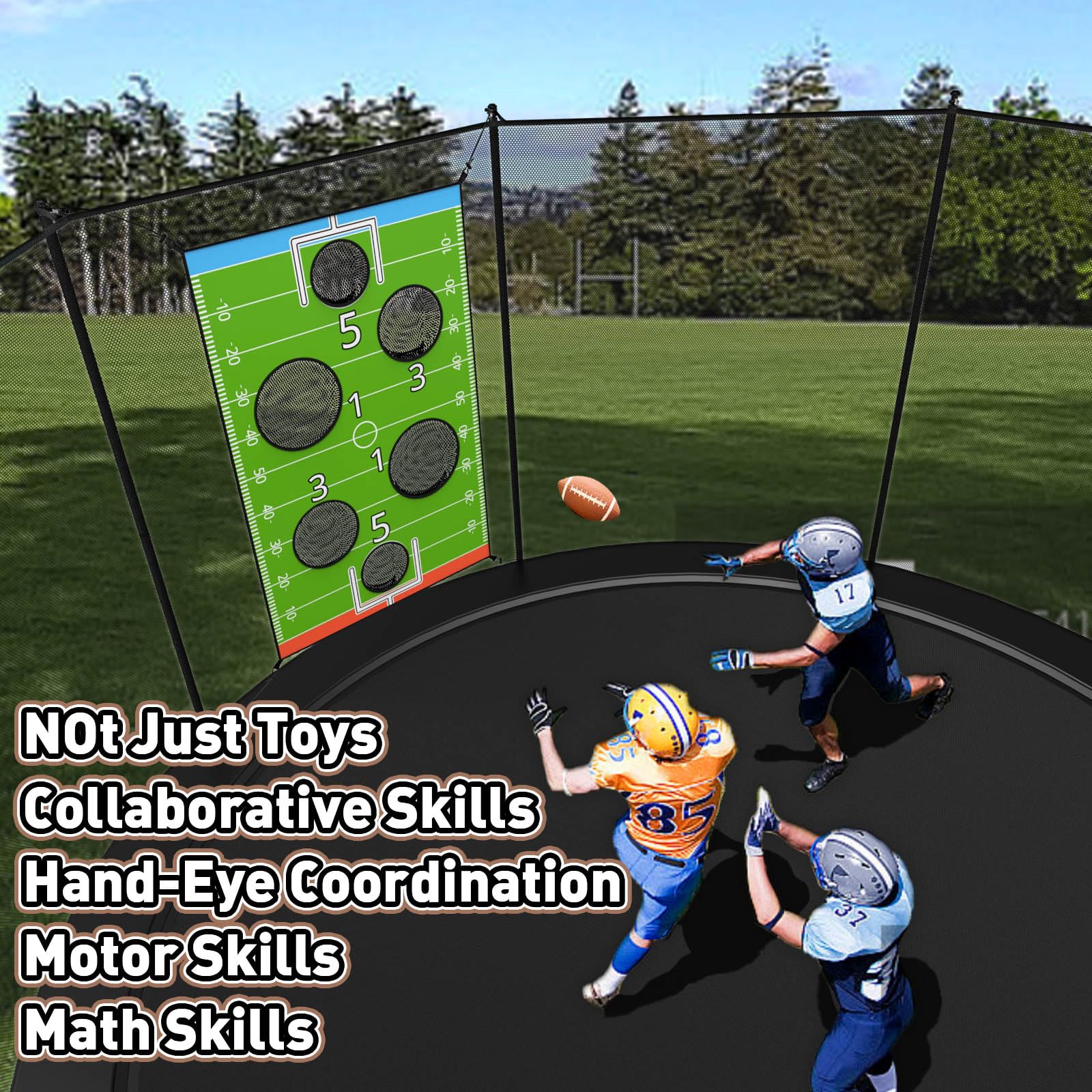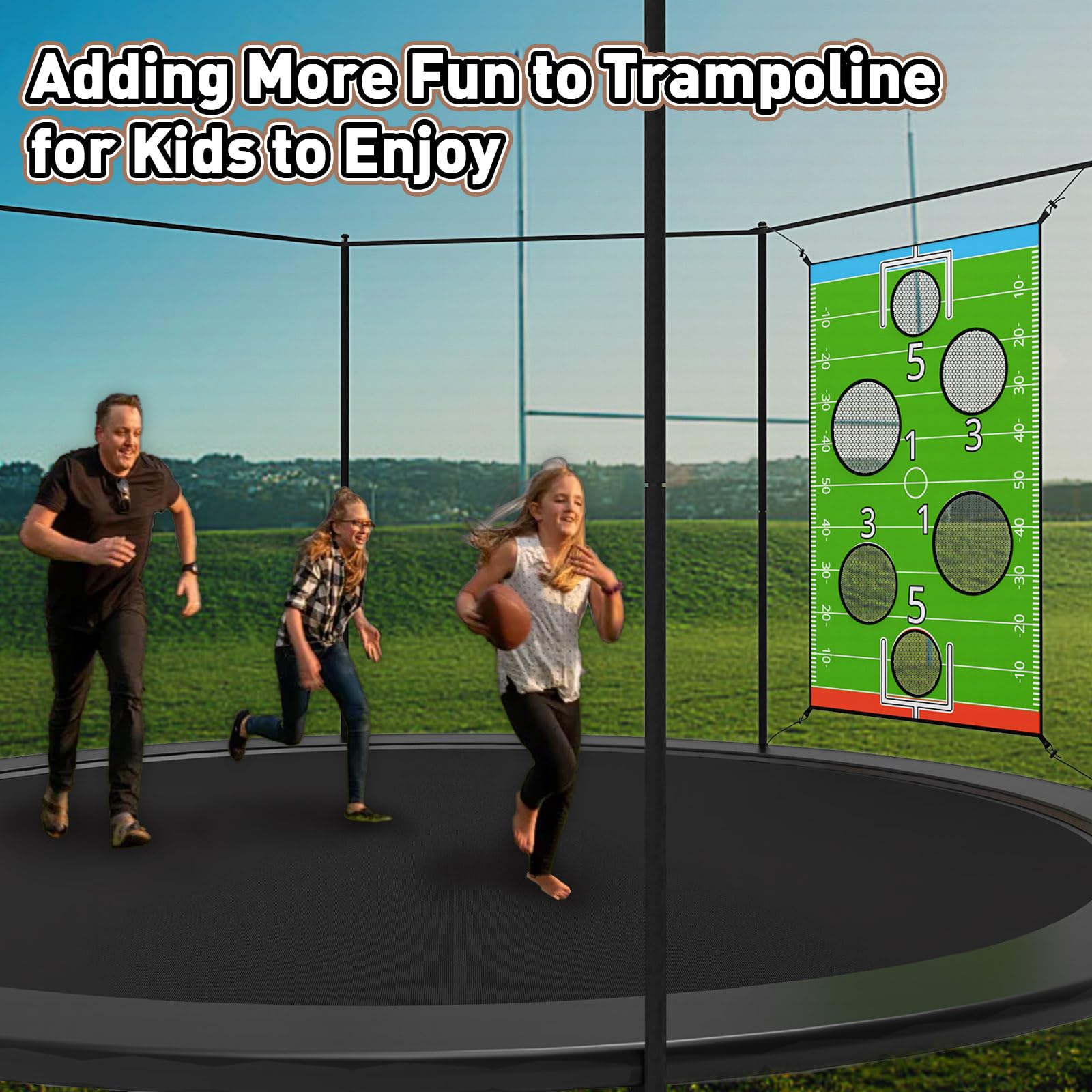 American football-themed game, in addition to being played on a trampoline, offers endless fun both indoors and outdoors in a variety of venues such as gardens, parks, beaches or playgrounds.