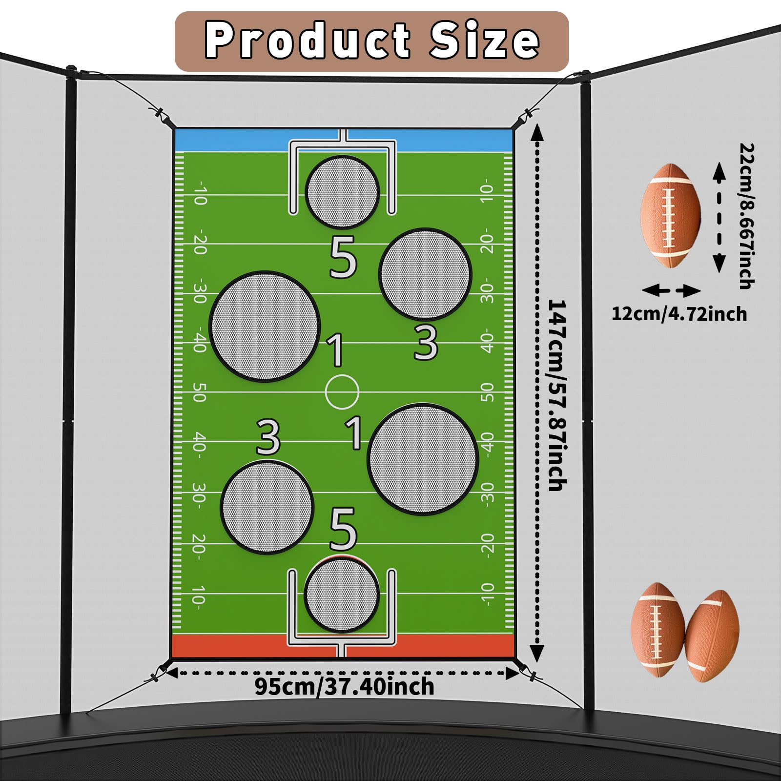 Comprehensive set: Includes 2 inflatable American footballs/rugby balls, a compact hand-held pump, a goal net with scoring zones, 4 elastic cords and clear instructions for quick assembly.