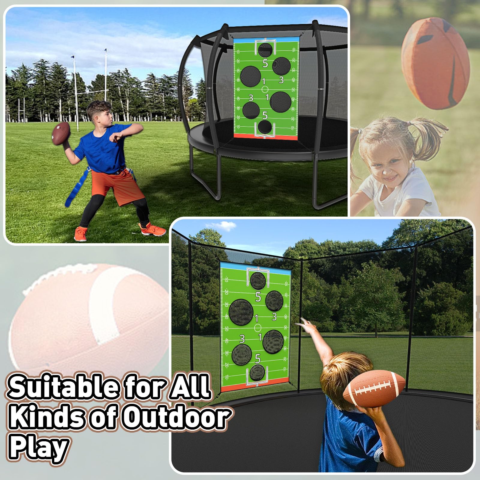 Purpose: The player's goal is to throw the football to one of six targets, with different target baskets of different sizes and different scores. Not only is it fun, it improves concentration levels, hand-eye coordination and math skills.
