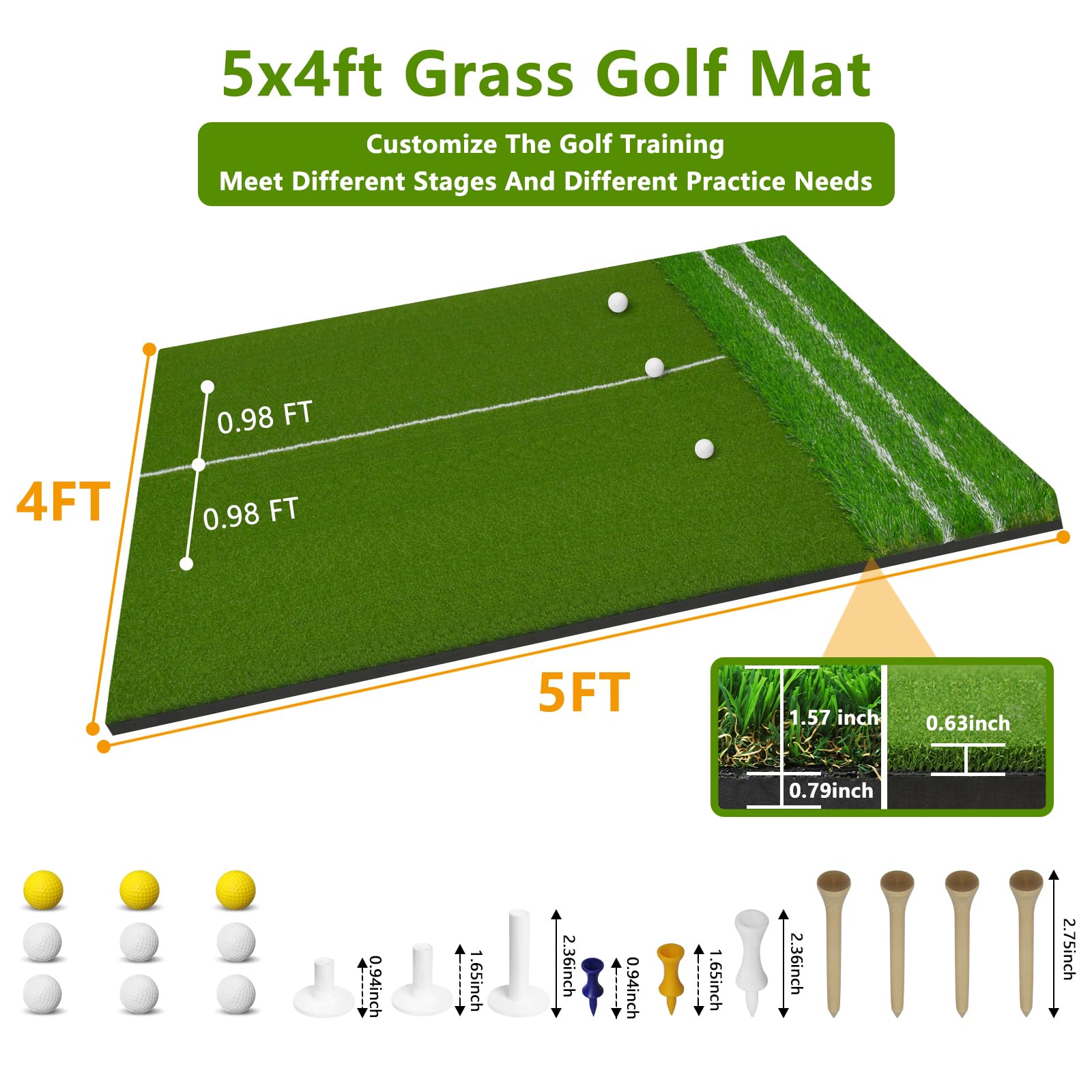 5x4ft Extra Large Size Golf Mat: The 5x4ft golf mat is large enough to provide spacious hitting area for full stance adjustments to provide maximum forgiveness for mis-hits. The 6 tee positions are designed for left/right-handed golfers, driving, chipping, and full swings. Great for all ages - From Beginner to Advanced