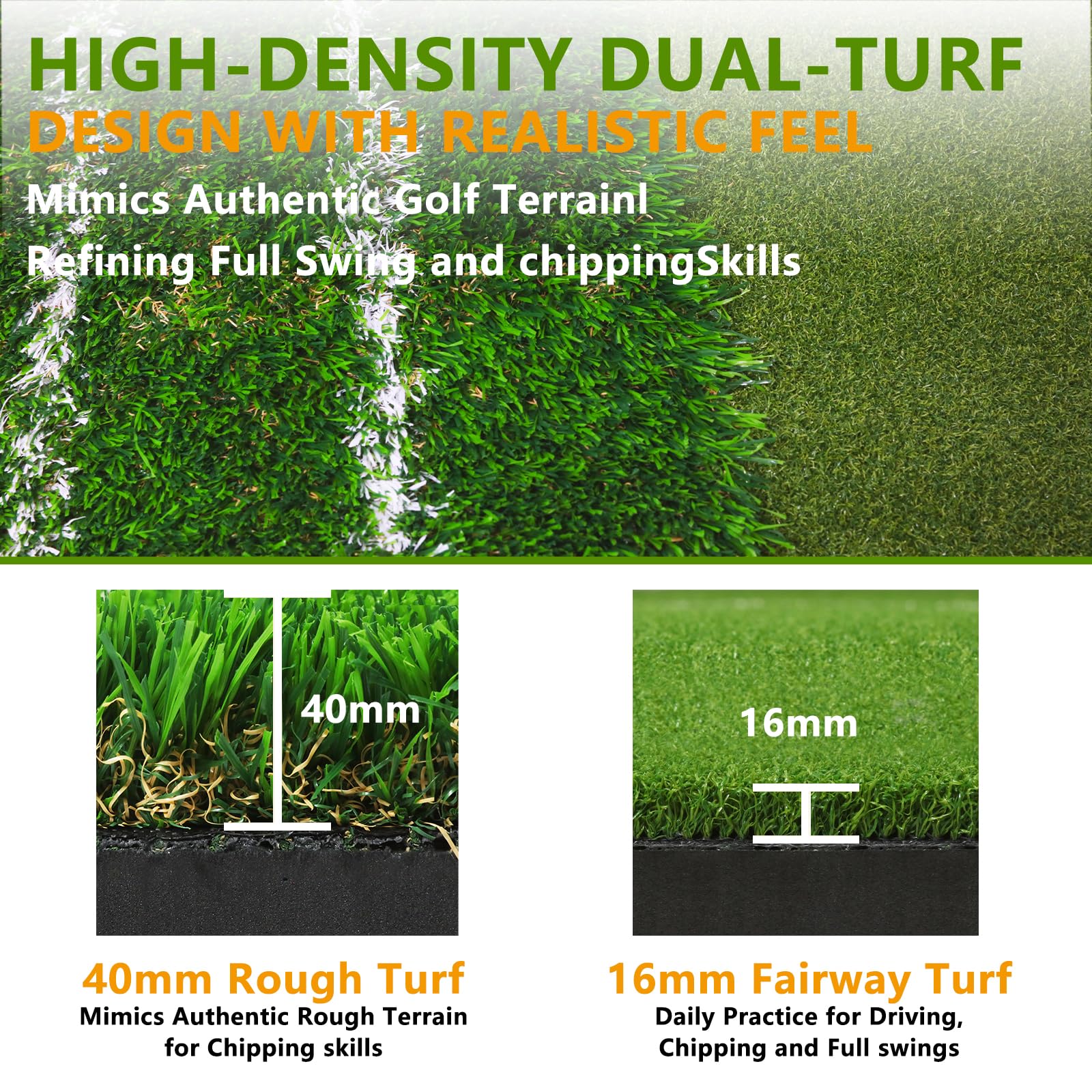 Ultra-Thick 36MM-60MM Cushioning & Shock Absorption: Designed with a heavy-duty 36mm to 60mm thickness system (16mm dense turf, 20mm high-elasticity EVA pad and 40mm rough turf) , this golf hitting mat absorbs over 90% of ground impact to protect clubs and joints. It provides maximum stability on any surface, ideal for daily practice on concrete, grass, or simulators