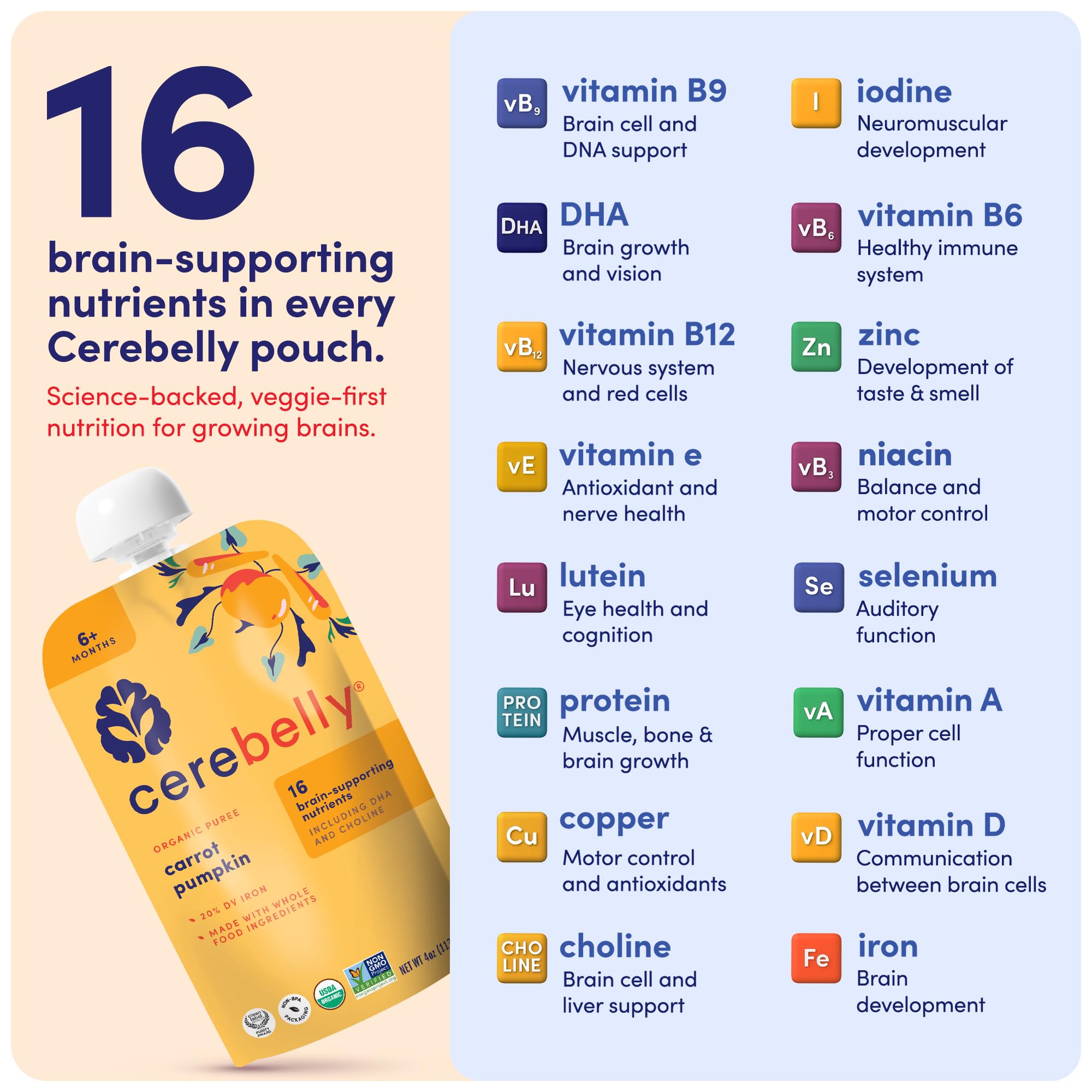 16 BRAIN-SUPPORTING NUTRIENTS – Only baby food with 16 nutrients for development, including potassium, iron & vitamin D