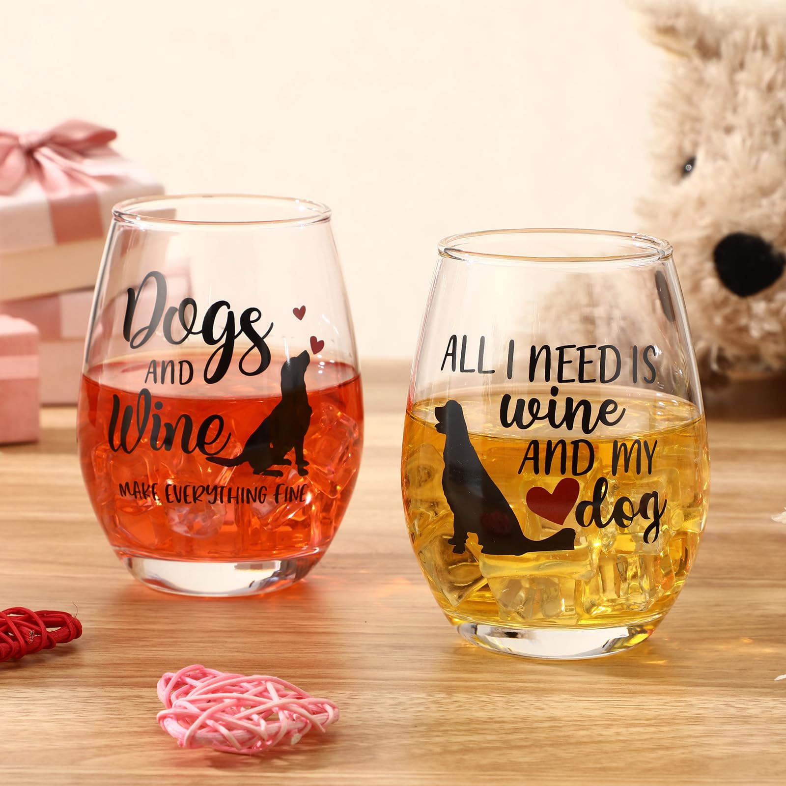 Dog Design of Wine Glasses: searching for an ideal gift for the dog lover in your life? Look no further! Our dog wine glasses feature two large - capacity stemless glasses, consisting of one black and one dark red stemless wine glass that can hold 15 ounces; They are boasted dog - themed patterns created by a laser engraved process; These glasses are not just ordinary cups; But a statement piece for every dog mom and dad, adding a delightful touch of fun to your sipping experience