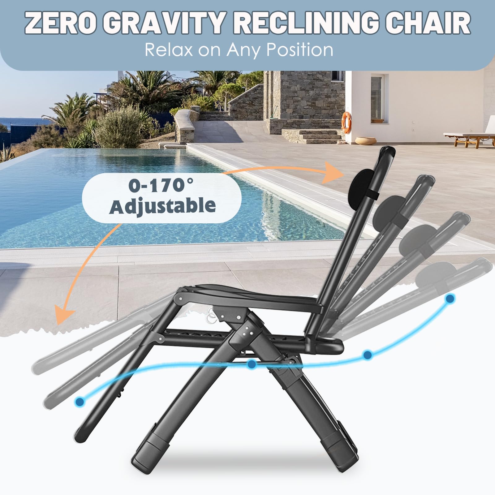 Adjustable and Zero-gravity: Our zero-gravity lounge chair has an adjustable design that can be adjusted from 90 to 170-degree angle. This amazing feature helps you select the optimal angle that brings you to a comfortable, relaxing position. Simply push the clip to unlock the position, and pull the clip back to secure it at your desired position. Note: Full-flat chaise lounge chair has no function of zero gravity