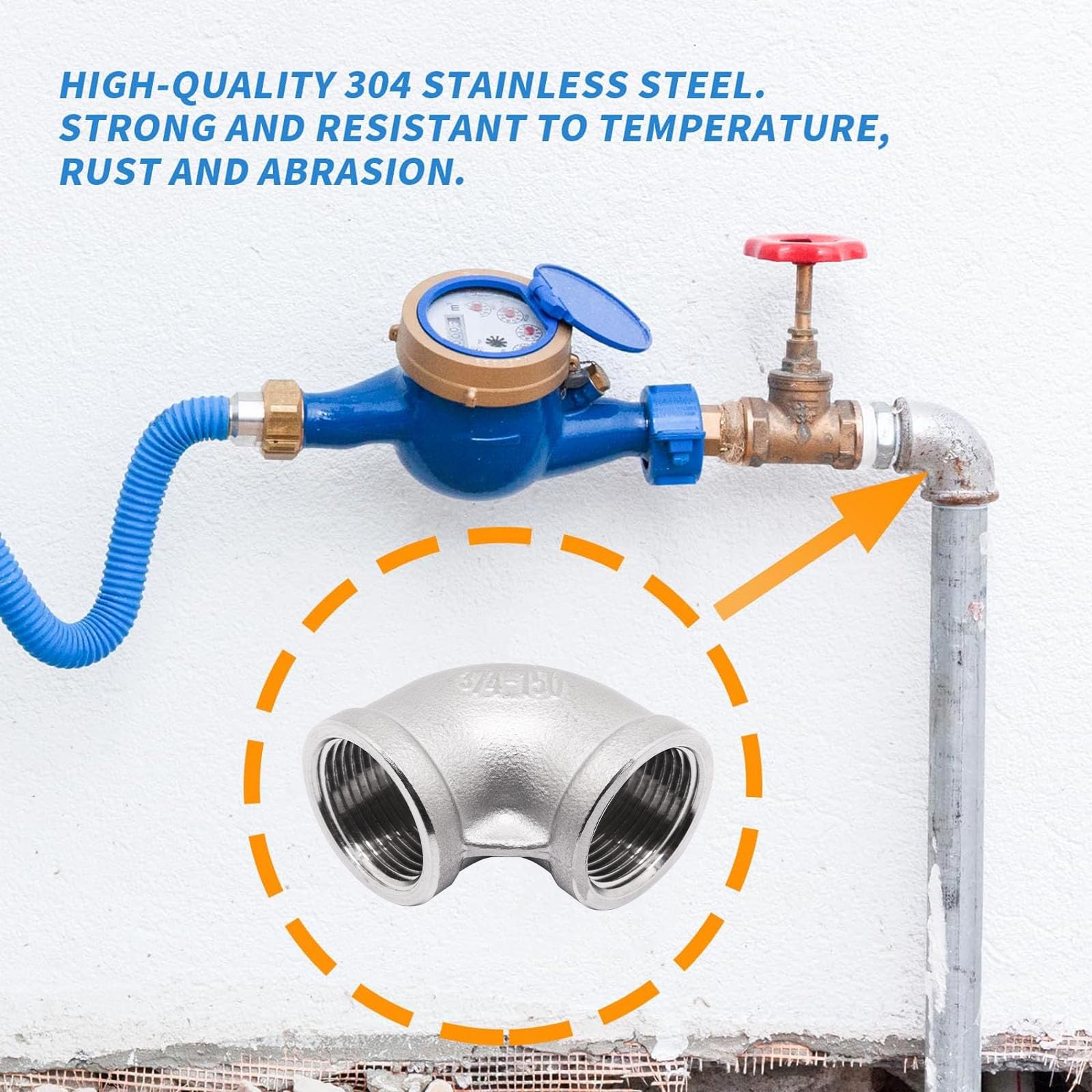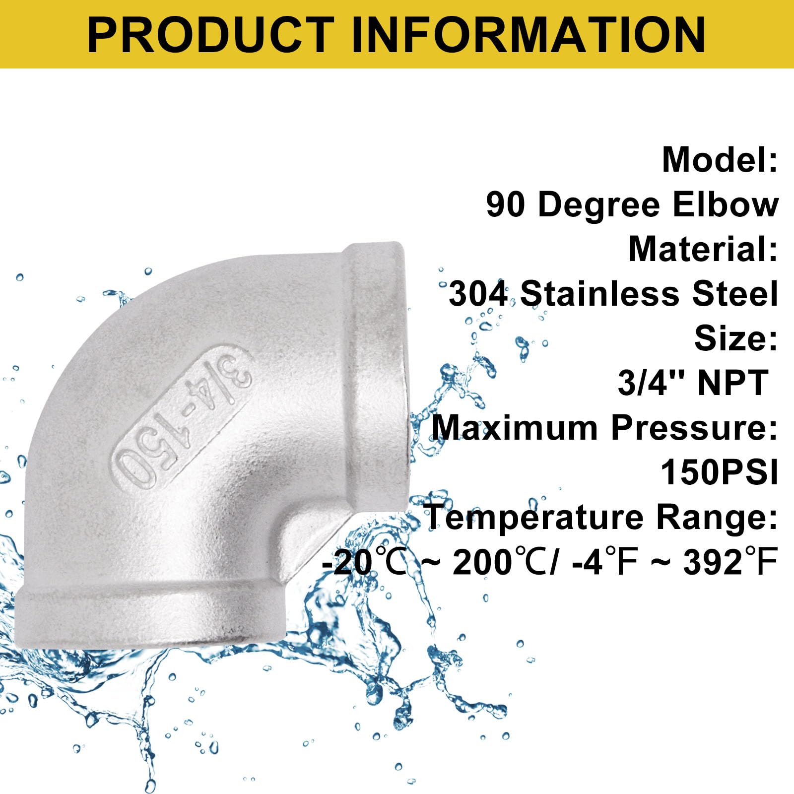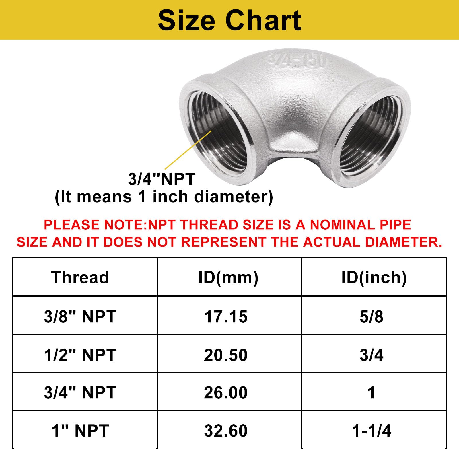 Package Content: 2Pcs 90° Elbow Pipe Fittings. Type: 3/4" NPT Threaded. Inner Diameter:24mm/ 3/4". Outer Diameter: 32mm/1.26". Height: 32mm/1.26"