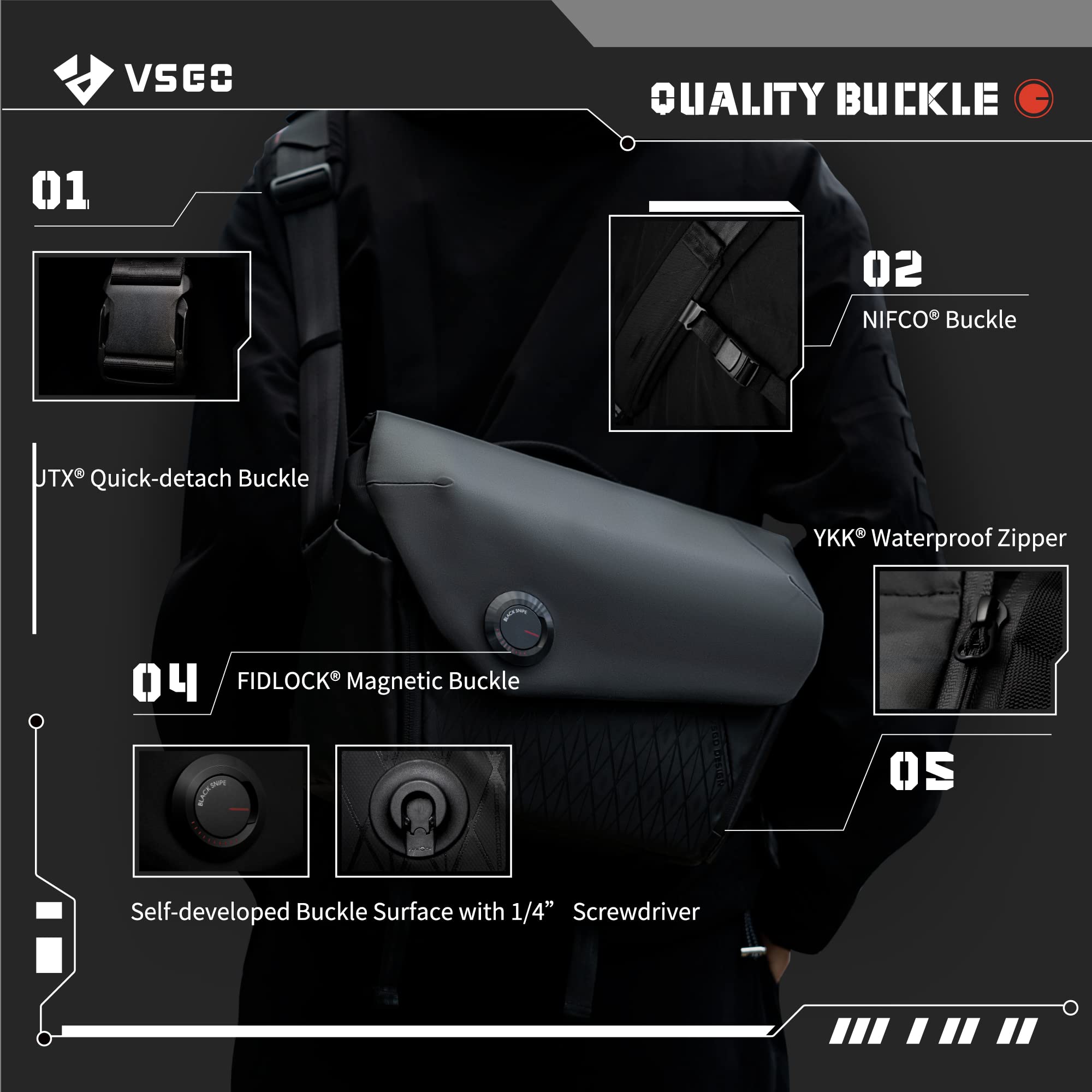 [Durable Hardware and Premium Materials] Built with top-quality components, including an exclusive 1/4" wrench coin buckle, Fidlock magnetic closure for fast access, UTX quick-release shoulder strap buckle, NIFCO high-strength side buckles, and YKK waterproof zippers, this camera bag ensures durability, reliability, and long-term performance in all environments.