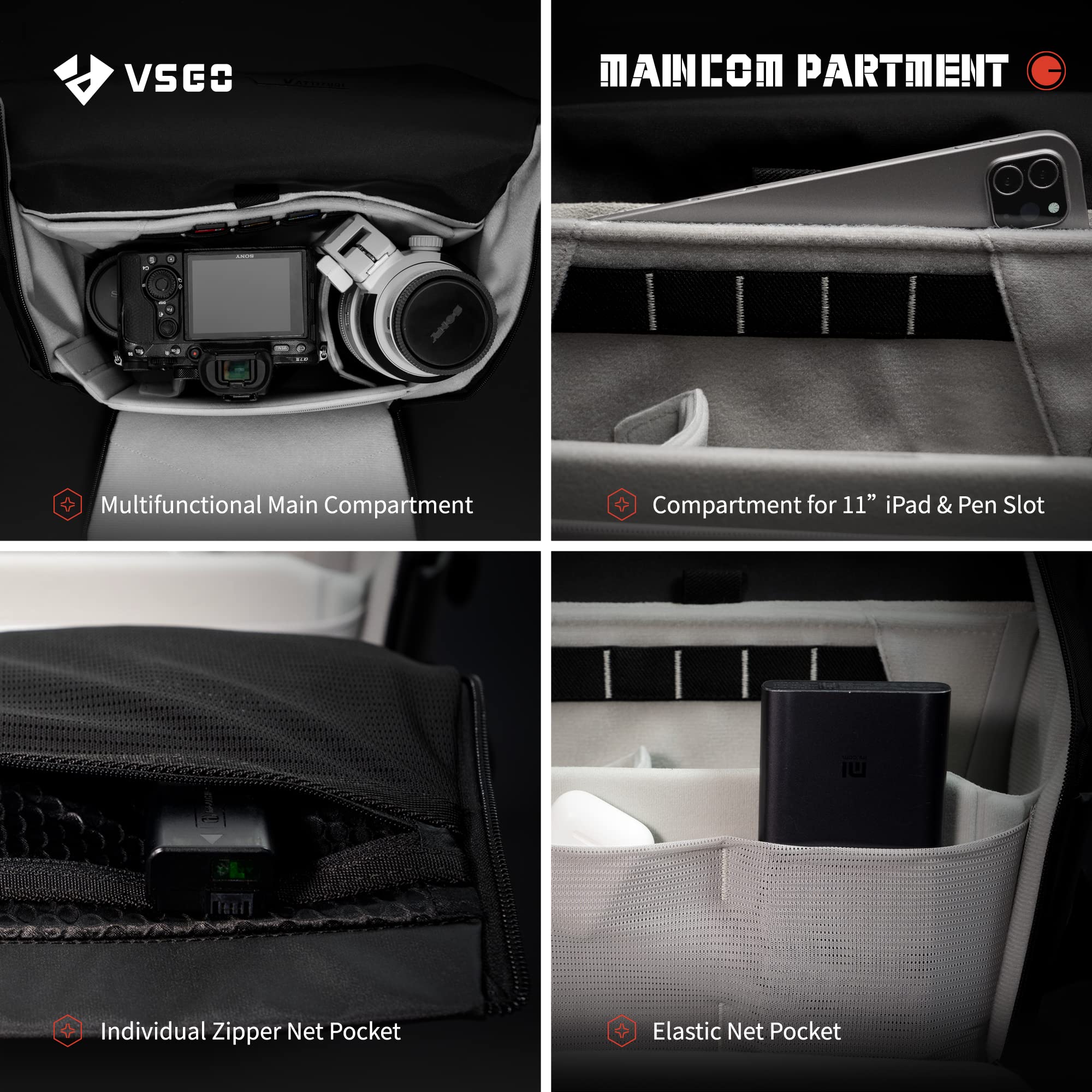 [Smart and Customizable Organization] The 6L photography bag features a spacious main compartment for a camera and 2–3 lenses, an 11-inch iPad sleeve with a dedicated pen slot, a rear zippered pocket for phones, a magnetic front pocket for quick access, elastic mesh pockets for SD cards and batteries, side pockets for small gear, and bottom webbing straps to secure a tripod — keeping everything in its place for easy access.
