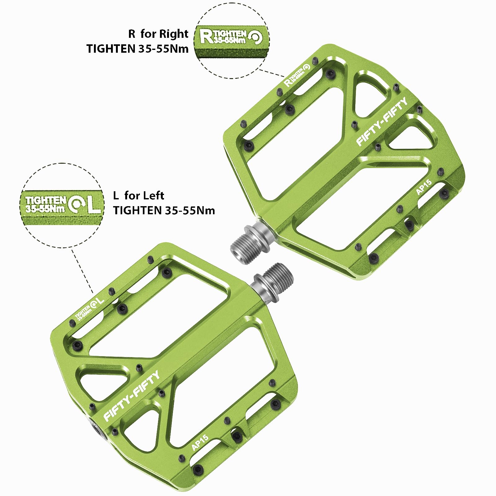 Light Weight and Easy to Install: The aluminum alloy MTB flat pedals are only 425g/15 ounce per pair, mark of LEFT for left and RIGHT for right. Sealed bearing bicycle pedals protect spindles from water and dust, also keep pedals spin smooth and without noise, let you enjoy cycling in raining, climbing, downhill