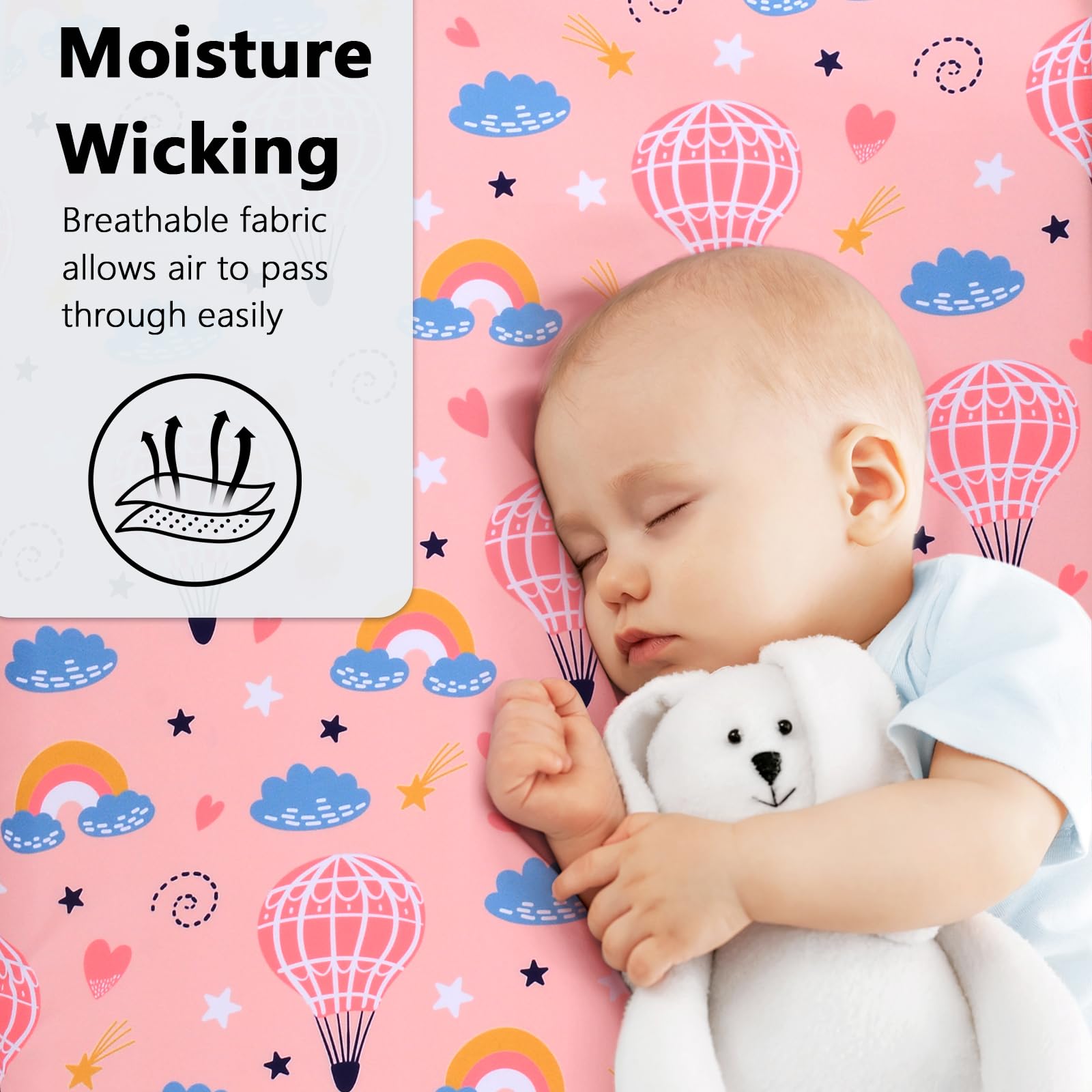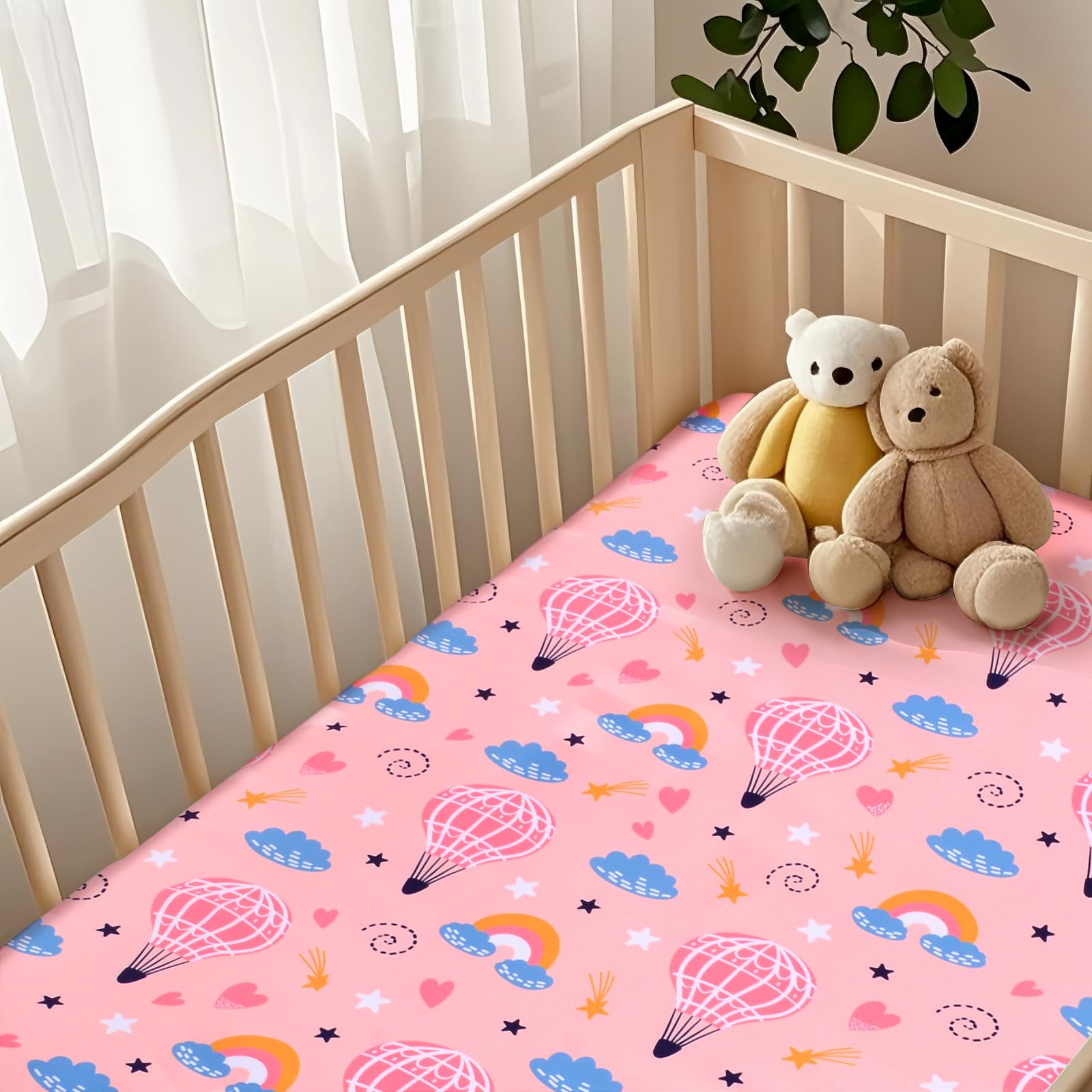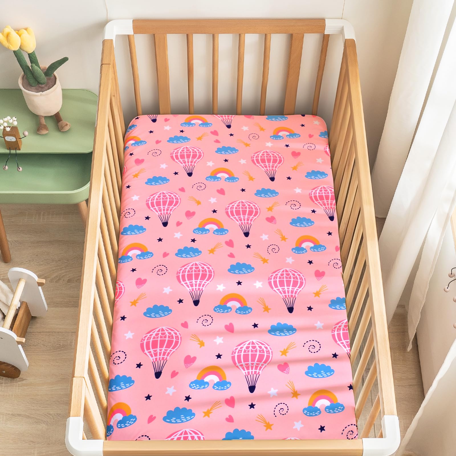 【Enchanting Hot Air Balloon Design】: Features vibrant, detailed prints of whimsical hot air balloons soaring through dreamy skies, creating a captivating focal point that sparks imagination and transforms the crib into a magical adventure space.