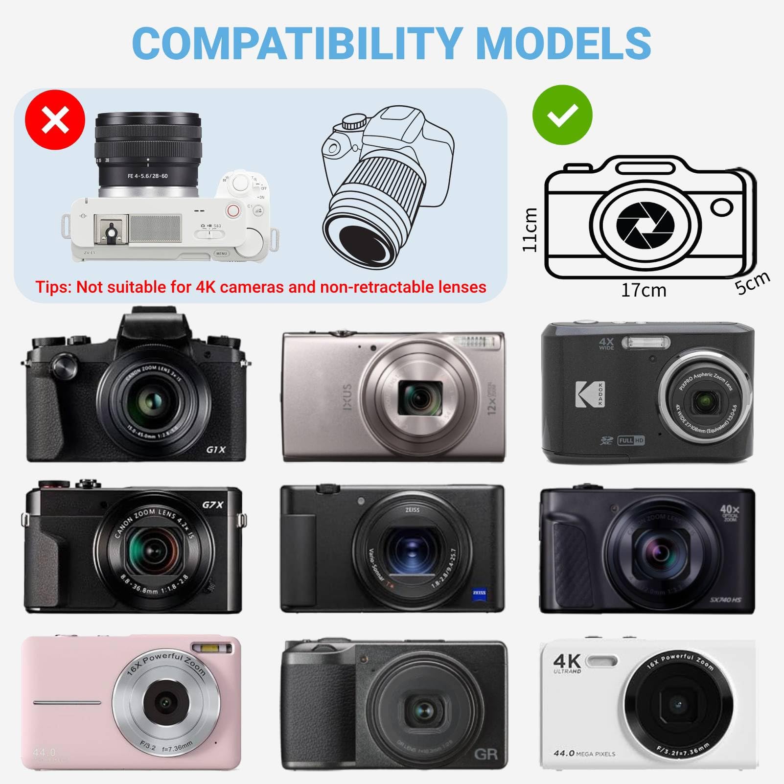 Effortless Compatibility: External Dimension:7*4.7*3.5", Internal Dimension:6.7*4.3*2".This camera case is designed to fit digital cameras such as the Sony DSCW800/DSCW830, Cannon PowerShot ELPH 180/190 and other appropriately sized cameras, charger and USB cable, to meet your various kinds of needs.