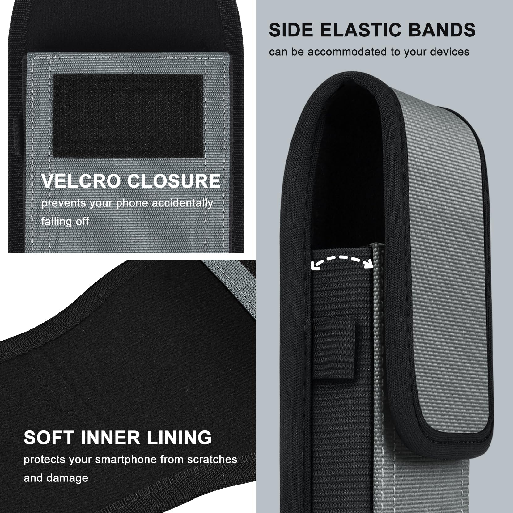 Security: Soft inner lining helps protecting your phone from scratches; Velcro closure helps protect your phone from accidentally falling off; Side elastic stretch bands can be accommodated to your devices