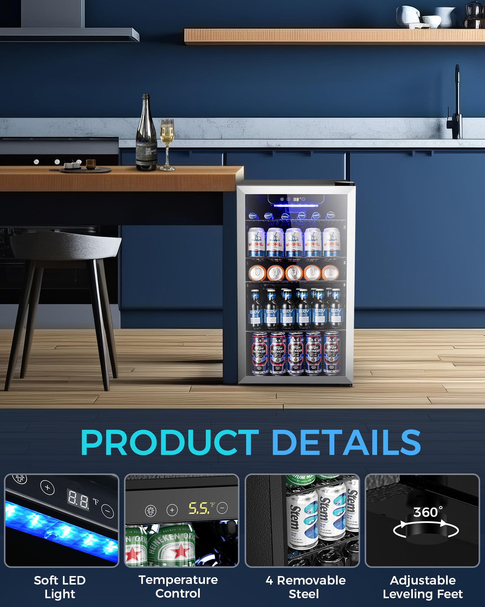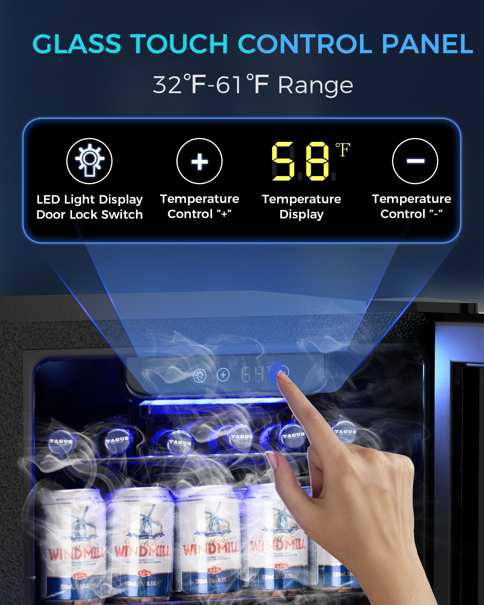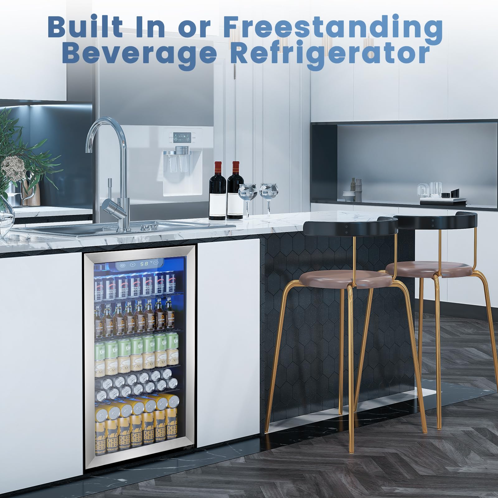 Quiet Operation(less than 38db)& Versatile Placement - Designed to fit seamlessly under most countertops, this beverage cooler saves valuable floor space while keeping drinks within easy reach. It also works as a freestanding unit, ideal for man caves, basements, game rooms, home bars, or garages. With ultra-quiet operation, it won’t disturb your daily life or relaxation time.