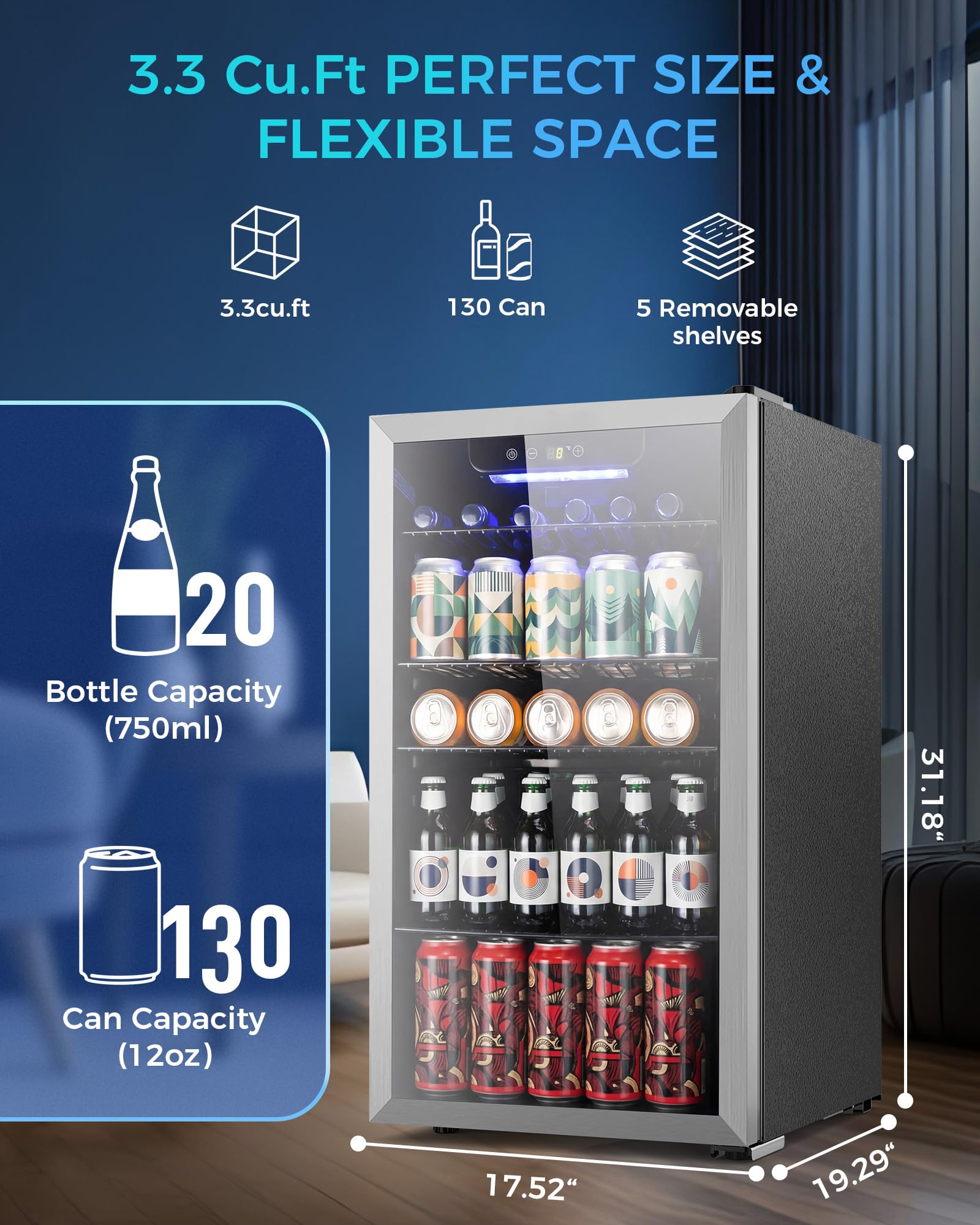 Built-In/Freestanding Beverage Refrigerator - 3.1 Cu.Ft / 130-Can Capacity. Maximize your storage without sacrificing space! Perfect for stocking beer, soda, bottled water, and even wine bottles. The 4 adjustable wire racks let you customize the interior layout for different-sized drinks, while built-in LED lighting makes it easy to find your favorite beverage in the dark, even at night parties.