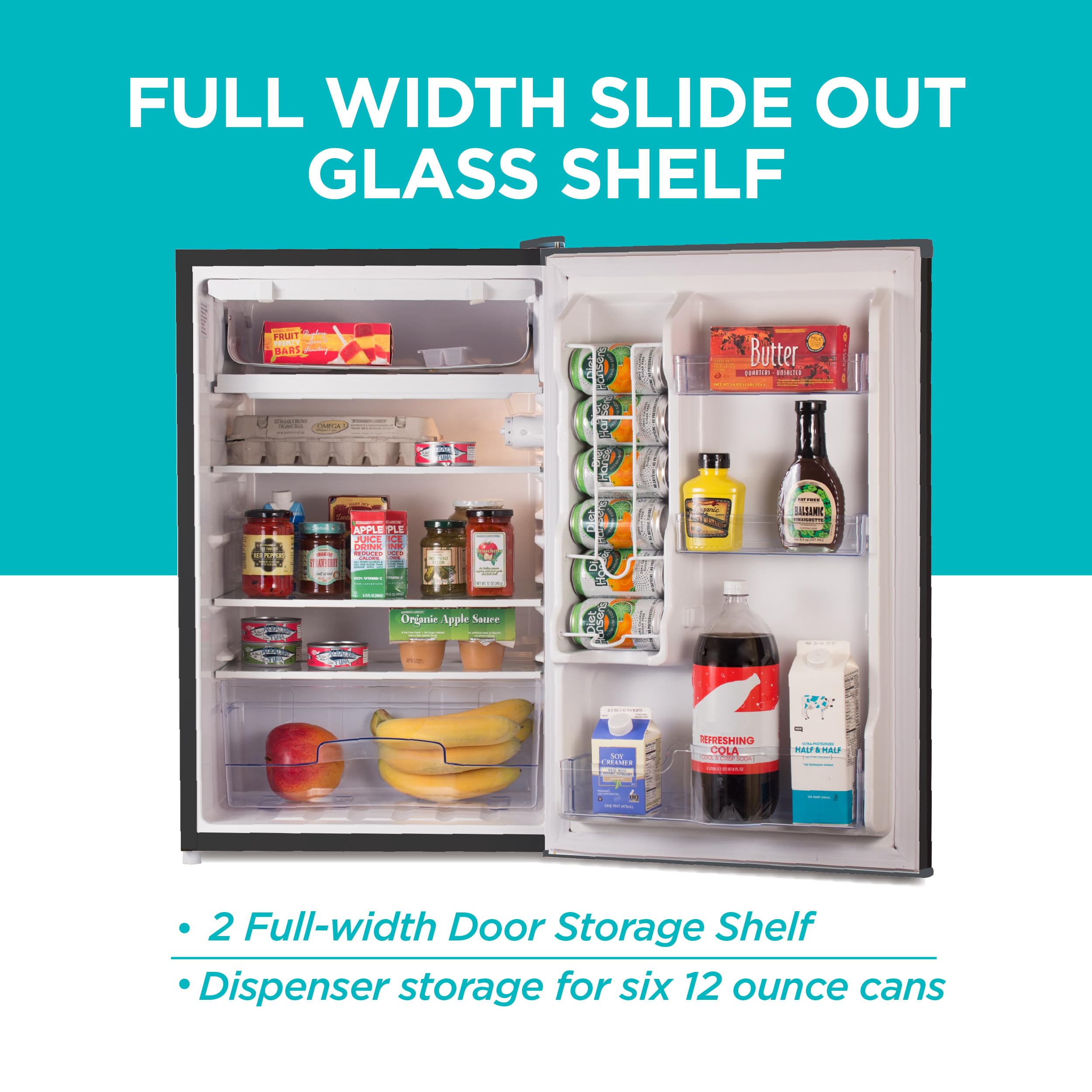 Spacious Capacity: Two removable glass refrigerator shelves help expand storage space while full and half-width door storage bins accommodate cans and small containers or 2-liter bottles