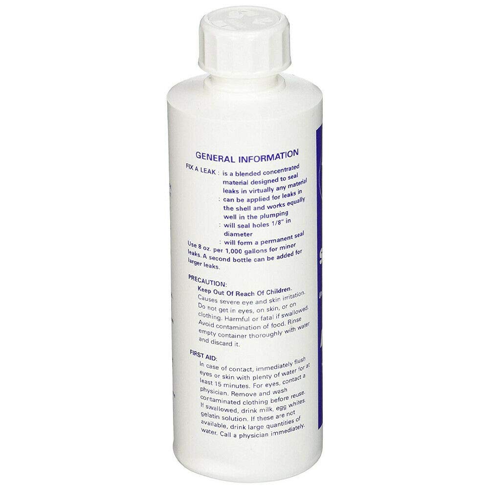 Use 1 quart per pool up to 22,000 gallons. Do not use in excess of 1 quart per 5,000 gallons of water. RETURN LINE REPAIR INSTRUCTIONS: * Shake Well Before Using* Bypass FILTER MEDIA before adding FIX-A-LEAK to water. Sand filters: set filter valve to recirculate. Other types: remove cartridges DE elements from filter tank. Then proceed to circulate through empty tank With pump running, add FIX-A-LEAK slowly through skimmer or in front of any other suction intake. After adding FIX-A-LEAK adjust suction to main drain. If this is not possible, the vacuum cleaner could be used alternatively simply by placing the vacuum in deepest part of pool and connect to normal vacuum connection. FIX-A-LEAK is very heavy and will sink to the lowest point rather quickly. It must be stirred back into suspension- either manually using a pool broom or mechnically with an automated pool cleaner- every 4-6 hrs. during circulation of water. Continue to recirculate water until the leak has stopped. Mark level of water in pool and check for 2-3 days to determine if the leak has stopped. After the leak has stopped and given the proper time to cure (24-48 hrs.) You may return to normal filtration. Sand Filters: set filter valve to filter and resume normal operation. Backwash out unused FIX-A-LEAK as required. Other Types: Reinstall filter into tank and resume operation. Rinse out unsed FIX-A-LEAK from filter as required. *NOTE* Never let cartridges of DE elements be left to dry before they are cleaned. Treatment can be repeated if necessary. SUCTION SIDE REPAIR INSTRUCTIONS: *Shake well before using* Suction Leaks are usually known by air mixed with the water at the return fittings. In most cases suction lines only leak water when the filter pump is shut off. Normal circulation will simply draw FIX-A-LEAK away from the leak and if the pump is shut off the material will simply not get to the leak. You must reverse the flow of water, to force the material through the leak under pressure. Preferably 5-10 psi. untill the leak has stopped. When this has been achieved, gradually increase pressure to 15-25 psi. to ensure a proper seal. You will need a submersible pump and a drum or large garbage pail. The pump is placed in the drum. You then disconnect your problem skimmer or drain line at your pool pump. Temporary plumbing is required from the submersible pump into the skimmer/drain line you disconnected. Some more temporary plumbing is required from the skimmer/drain itself back into the drum or pail. You have created a closed loop. You will be pumping from the pail through the problem line back into the pail. Fill the drum with water and circulate for a while keeping an eye on the loss of water in the drum. This will give you an idea of how large your leak is. Once you have an idea of how much water you're losing fill the drum back up, mark your water line and add 32 oz of Fix A Leak. Circulate the product for 4-6 hours or until you are comfortable the leak has stopped. Once the leak has stopped allow at least 72 hours of cure time before returning to normal operation. You can flush your lines by emptying the drum of the Fix A Leak mixture and running fresh water through. Reconnect your plumbing lines back to your pool pump and you are ready for normal operation. SIMPLIFIED HOMEOWNER SUCTION SIDE REPAIR INSTRUCTIONS: Method used by a pool owner on a suction line leak. *Please Note: This method is for home owners who are not able to create a closed loop system and by circulating the water in reverse to create pressure on the line. Immerse bottle into a container of hot water for 10-15 minutes. Shake well before using. Most pumps do not provide a reverse flow. The way around this is to pour a half to a third of a 32oz size bottle of Fix A Leak into the skimmer with the pump off, then turn the pump on for two seconds to move the product into the line. Then with the pump off, add the remainder of Fix A Leak into the skimmer and let it sit for three days. This has worked for many pool owners in creating a reverse flow. Always ensure the line is filled with water, Fix A Leak remains soluble in water, once exposed to air it will harden. This method will only achieve success if the leak is on the bottom portion of the line, as Fix A Leak is heavier than water and will sink to the lowest point, if it is not circulated. This method will usually be effective 70% of the time.