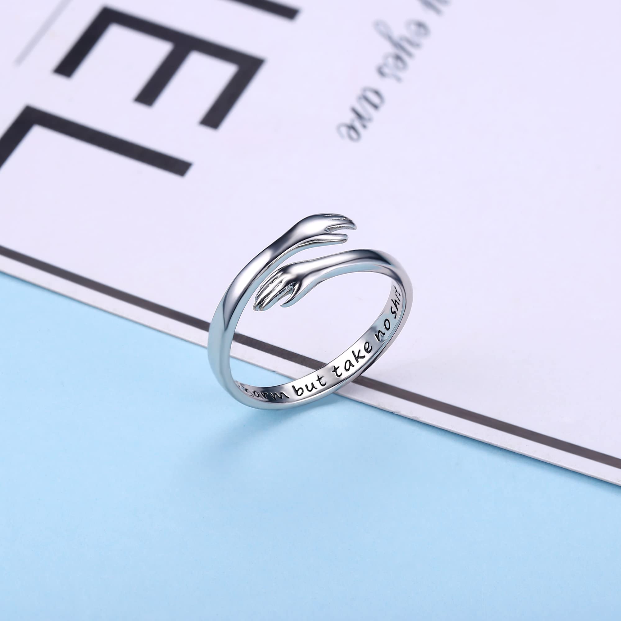 The love hugging hands rings made of high quality s925 sterling silver with excellent polishing and electroplating craftsmanship, which will make it look gorgeous and sparkling. Our fashion hug ring is nickel free, lead free, cadmium free, allergy safe to skin and not break, tarnish, fade easily.