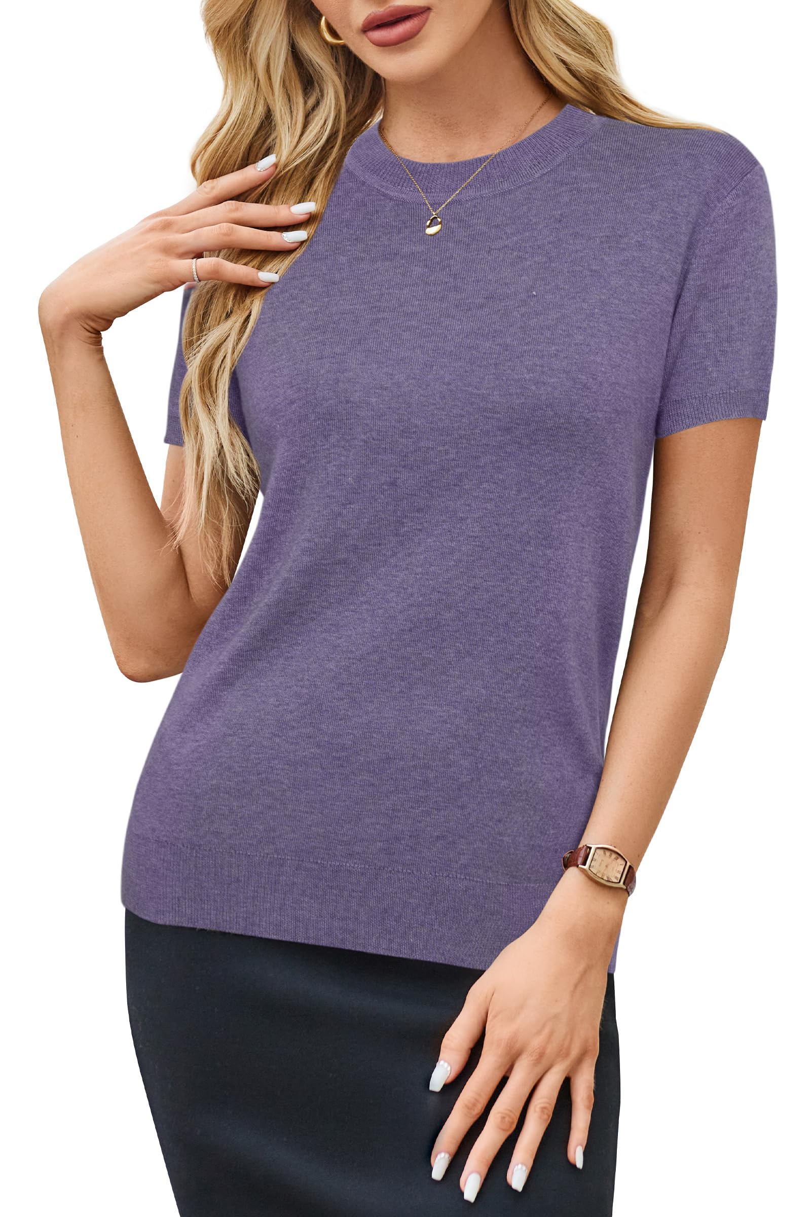Features: Women's Summer Tops/ Essential Pullover Sweater/ Classic/ Loose Fit/ Short Sleeve/ Crew Neck/ Elastic Hem/ Solid Color