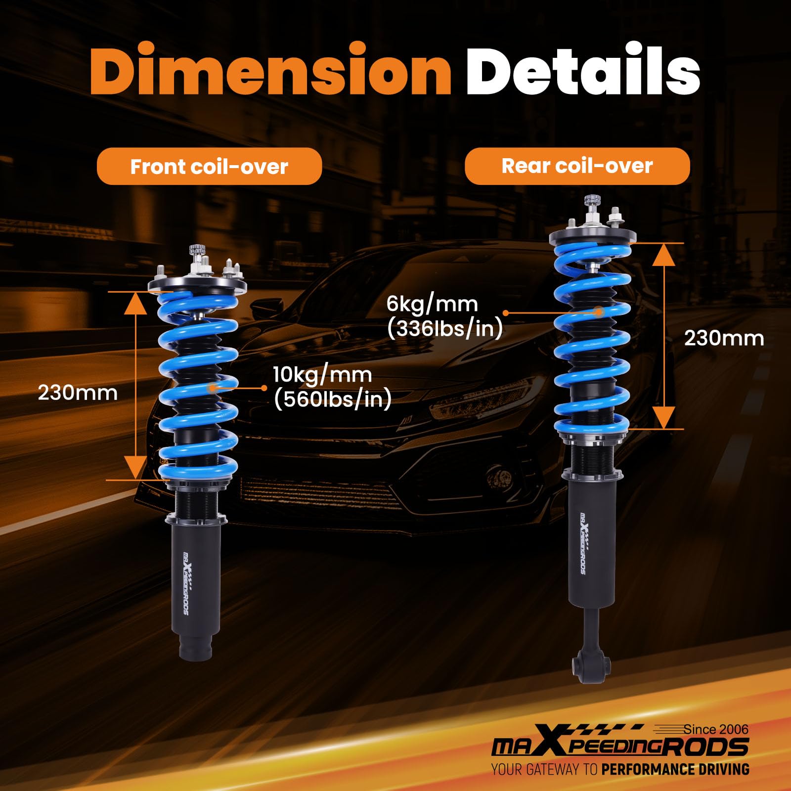 【High Tensile Springs】 Spring rate Front: 10kg/mm(560 lbs/in)& Spring rate Rear: 6 kg/mm (336 lbs/in) with spring preload: 7-10 mm. High tensile performance spring - stress tested over 600,000 times while the spring distortion is less than 0.04%
