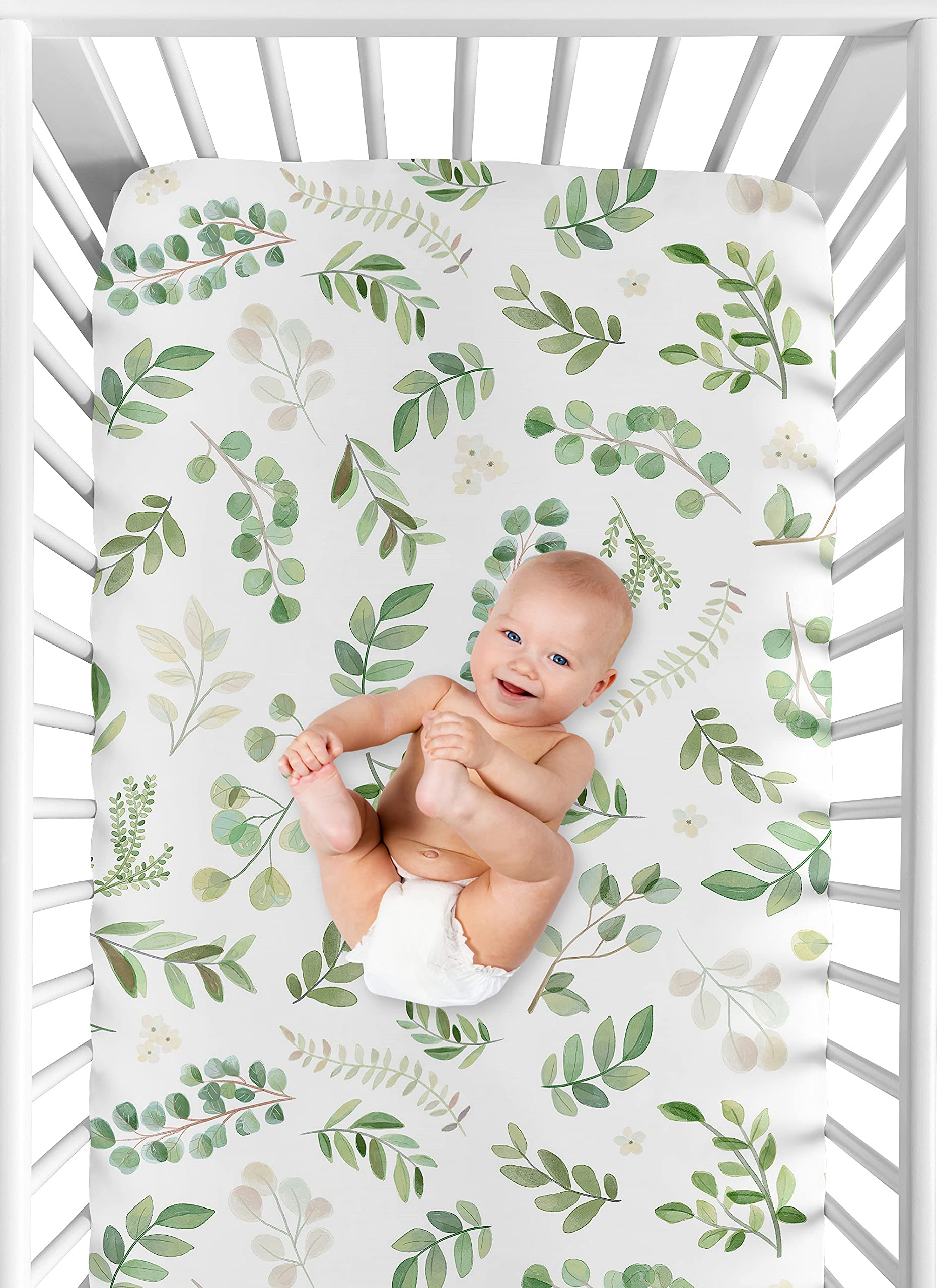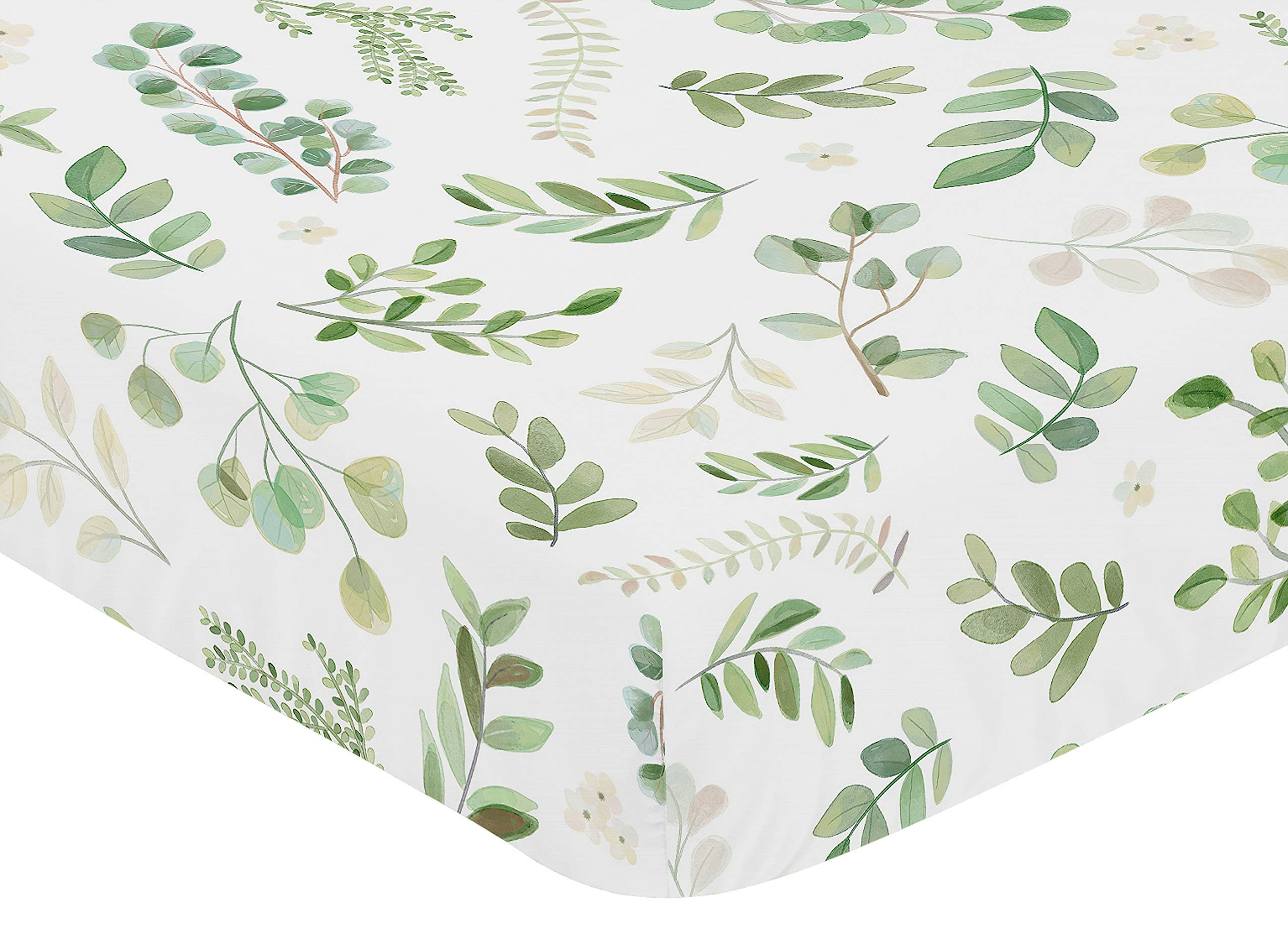SNUG FIT: Includes (1) Fitted Crib Sheet 52in. x 28in. x 8in. Our newborn standard crib sheets fit snugly, with premium elastic sewn around the entire bottom edge for a secure fit on most standard sized cribs and toddler beds, to reduce shifting and bunching. This soft cotton fabric crib sheet features a sage green & white garden, bohemian, wildflower, flower, leaf, boho, tropical, woodland, nature, floral botanical print and is gentle on delicate skin to foster a soothing sleep environment.