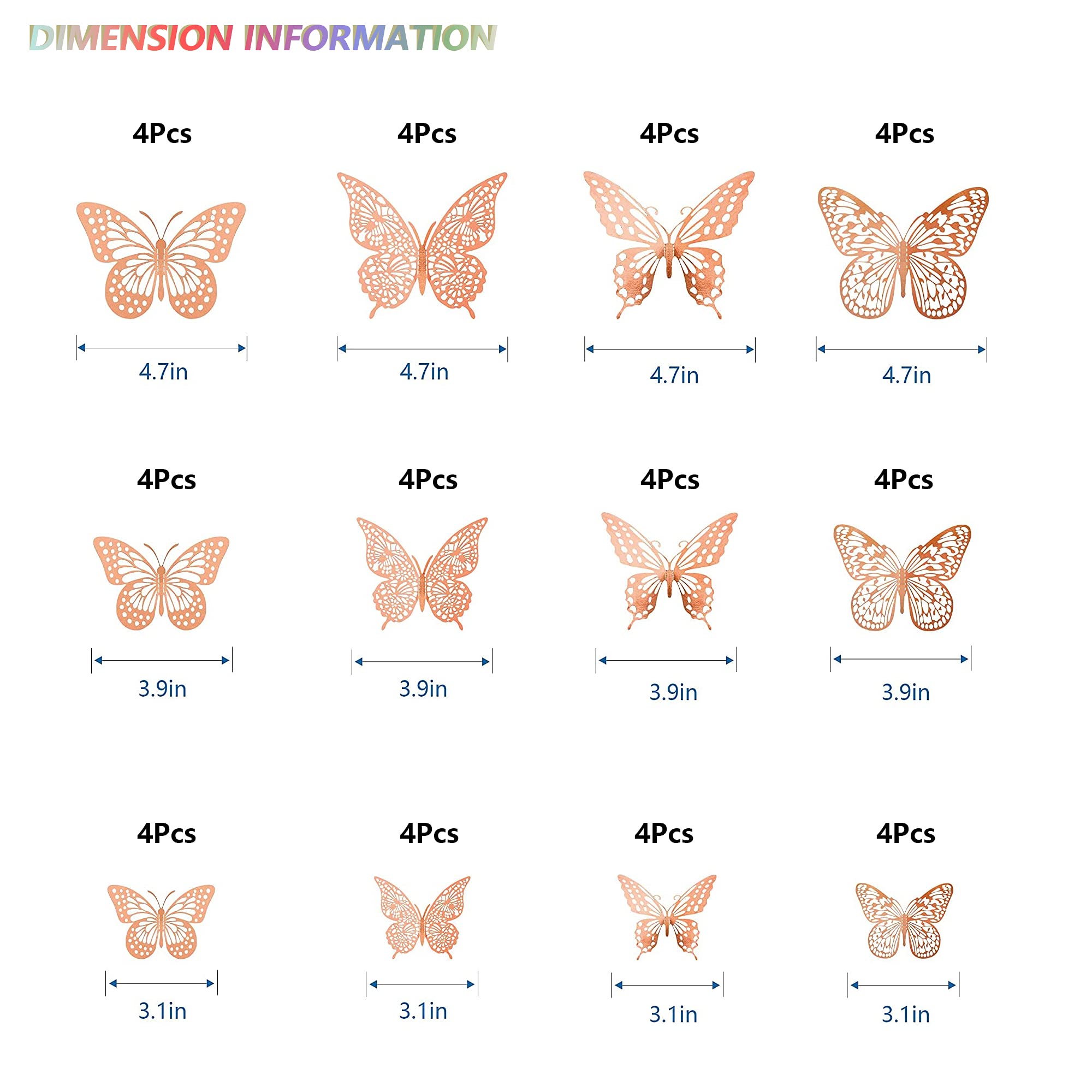 【Package Included】48 pcs butterfly wall stickers: 12 pcs Style 1, 12 pcs Style 2, 12 pcs Style 3, 12 pcs Style 4, each style has 3 sizes(3", 4", 5"). Coming with 48 pcs double sided adhesive dots.