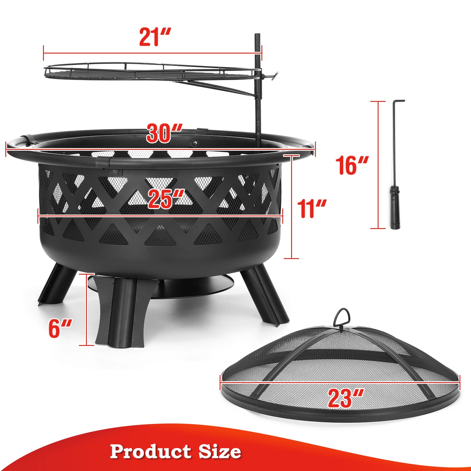 🔥【Versatile Design】Overall Size: Dia 30" x 23" H, fire bowl size: Dia 25" x 11" depth.Load Capacity: 150 lbs.Suitable for party of 3-5 people.Designed for dual use,including Swivel Cooking Grate for easy grilling.Large firepit can hold enough firewood,Diamond-shaped net provides better air circulation.Perfect for enjoy Barbecue with your children in backyard parties, camping,RV trips
