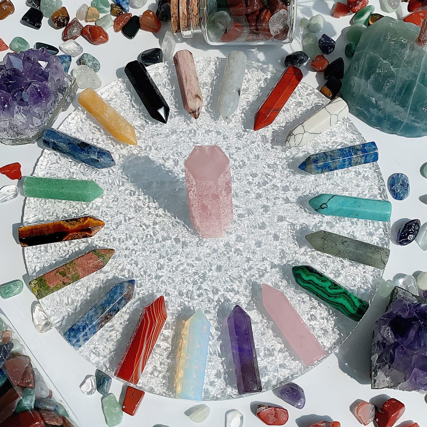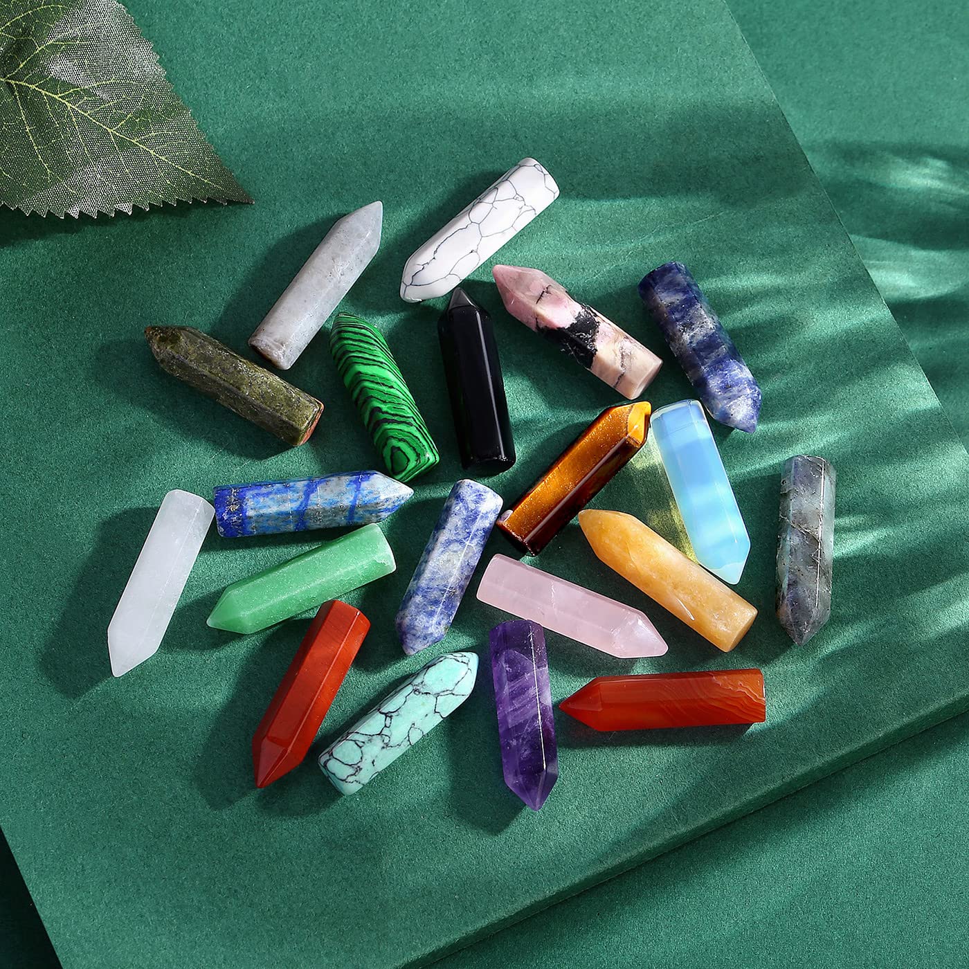 【 Basic Information 】 Specification attributes : 20 PCS Wands Hexagonal Single Pointed Crystals. -- Red Carnelian, Rose Quartz, Opalite, Amethyst, Lapis lazuli, Rhodonite, Red Jasper, Tigers Eye, Yellow Jade, Green Aventurine, Blue Sodalite, Clear Crystal, Blcak Labradorite, Black Obsidian, Unakite, Grey Labradorite, White Howlite Turquoise, Green Turquoise, Malachite, Blue White Sodalite. (approx.)Size : 1.26*0.32 ".