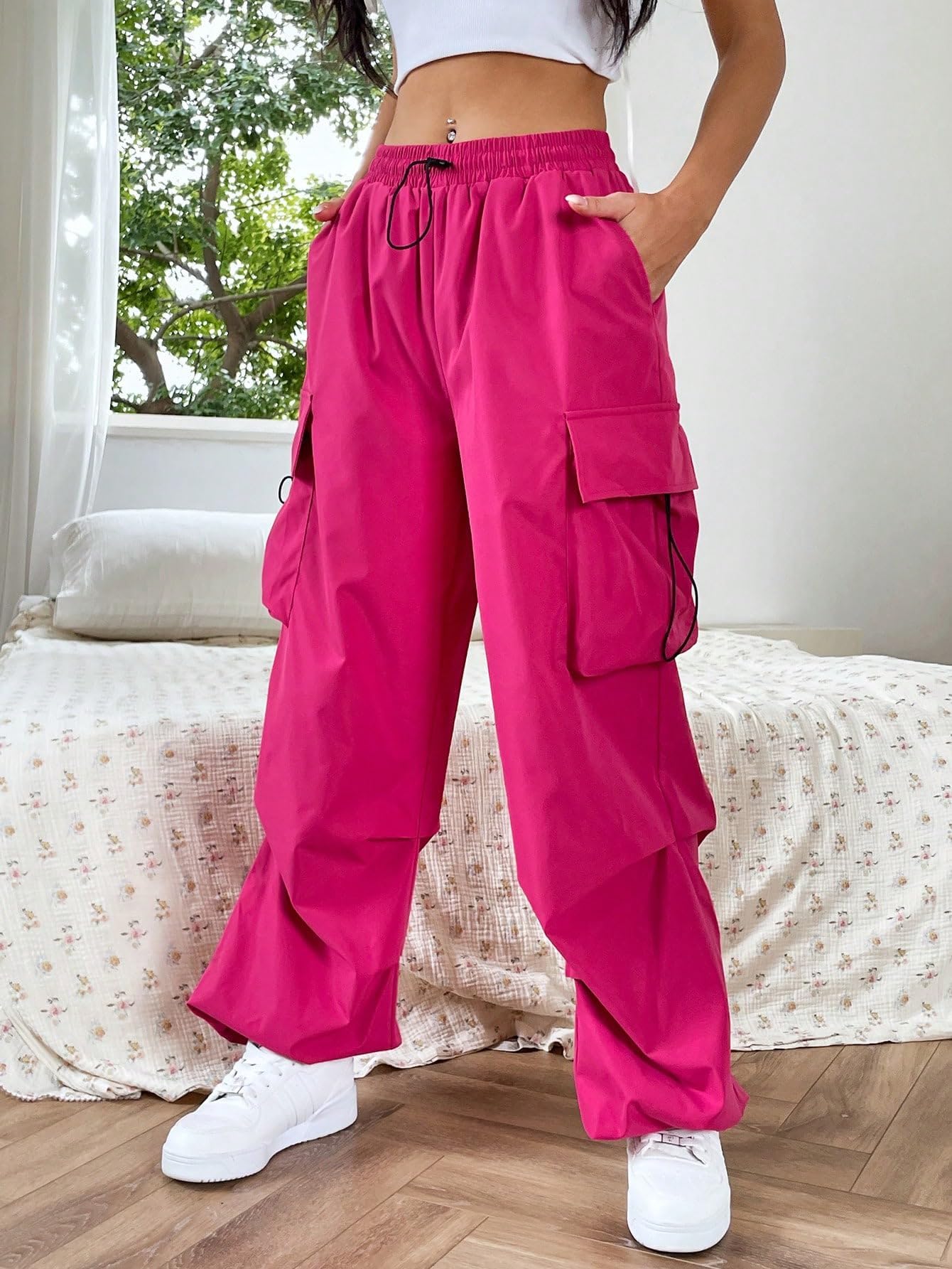 Features: Drawstring waist and hem, flap pockets, wide leg, loose fit, full length, plain color