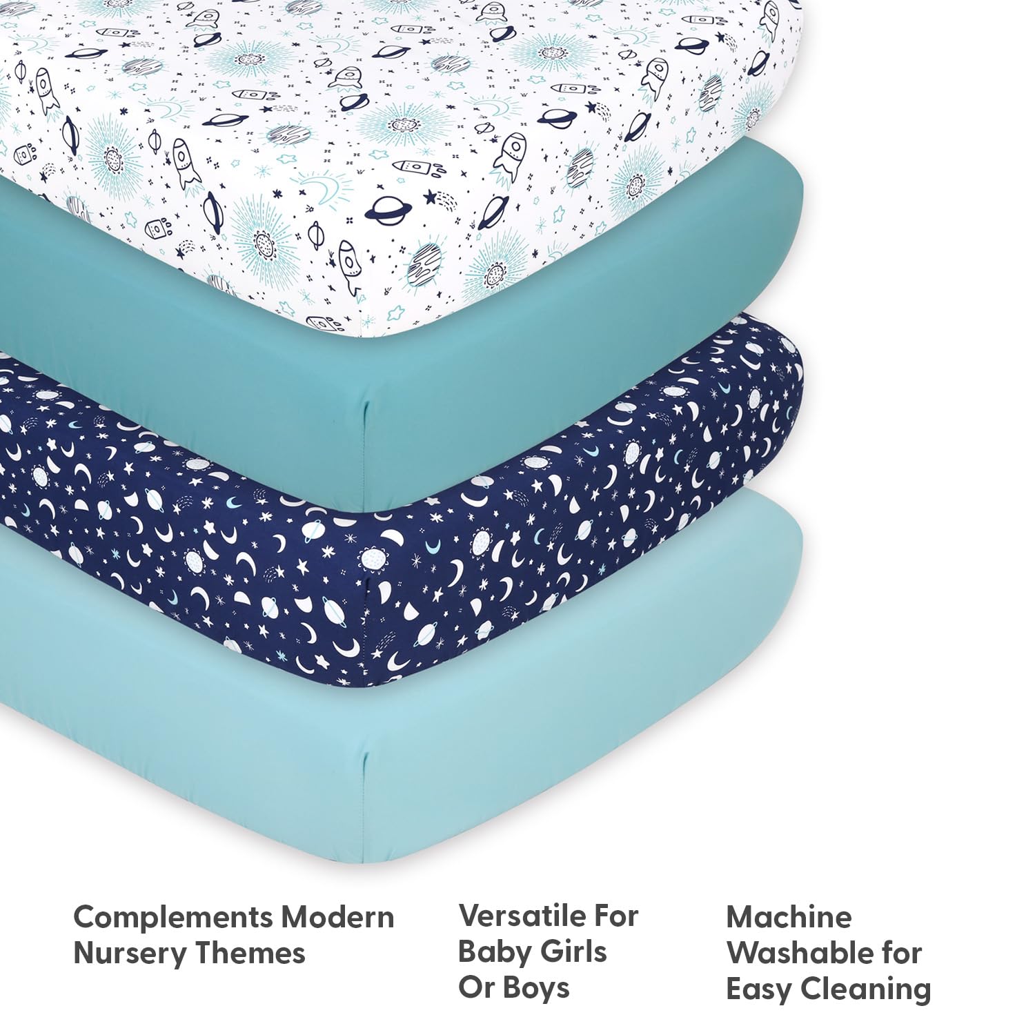 Galactic Crib: Featuring whimsical rocket ships, twinkling stars, and cosmic planets in soothing blue tones, these crib sheets add playful charm and style to any nursery, making them optimal for boys and girl and an ideal baby shower gift.