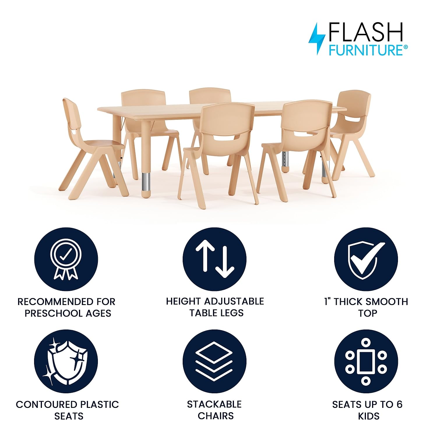 Amplify any classroom or playroom with the functionality and convenience of the Flash Furniture Emmy Adjustable Activity Table Set. This versatile plastic activity table and chairs set offers endless possibilities in your home or classroom and is great for learning, playing, arts and crafts, meal time, homework, and much more. Featuring sturdy adjustable legs, the classroom table gives you the flexibility to raise or lower its height to accommodate kids and toddlers up to the age of 7. The stackable shell chairs with a 10.5" seat height are contoured for comfort to promote proper posture throughout the entire school day and have no metal parts to help prevent injuries to small children. Not only are the one-piece chairs designed properly, but they're also lightweight to allow kids to feel independent by moving the chairs themselves. Floor glides protect flooring surfaces when you need to move the activity table and chairs around the classroom. Made with a 1" thick smooth laminate top with plastic safety rounded corners, this children's activity table helps prevent injuries. The rectangular activity table measures 23.625" W x 47.25" D x 14.5-23.5" H. Each chair measures 12.625" W x 13.5" D x 20" H with a 10" W x 10" D x 10.75" H seat size and 11" W x 10.5" H back size.