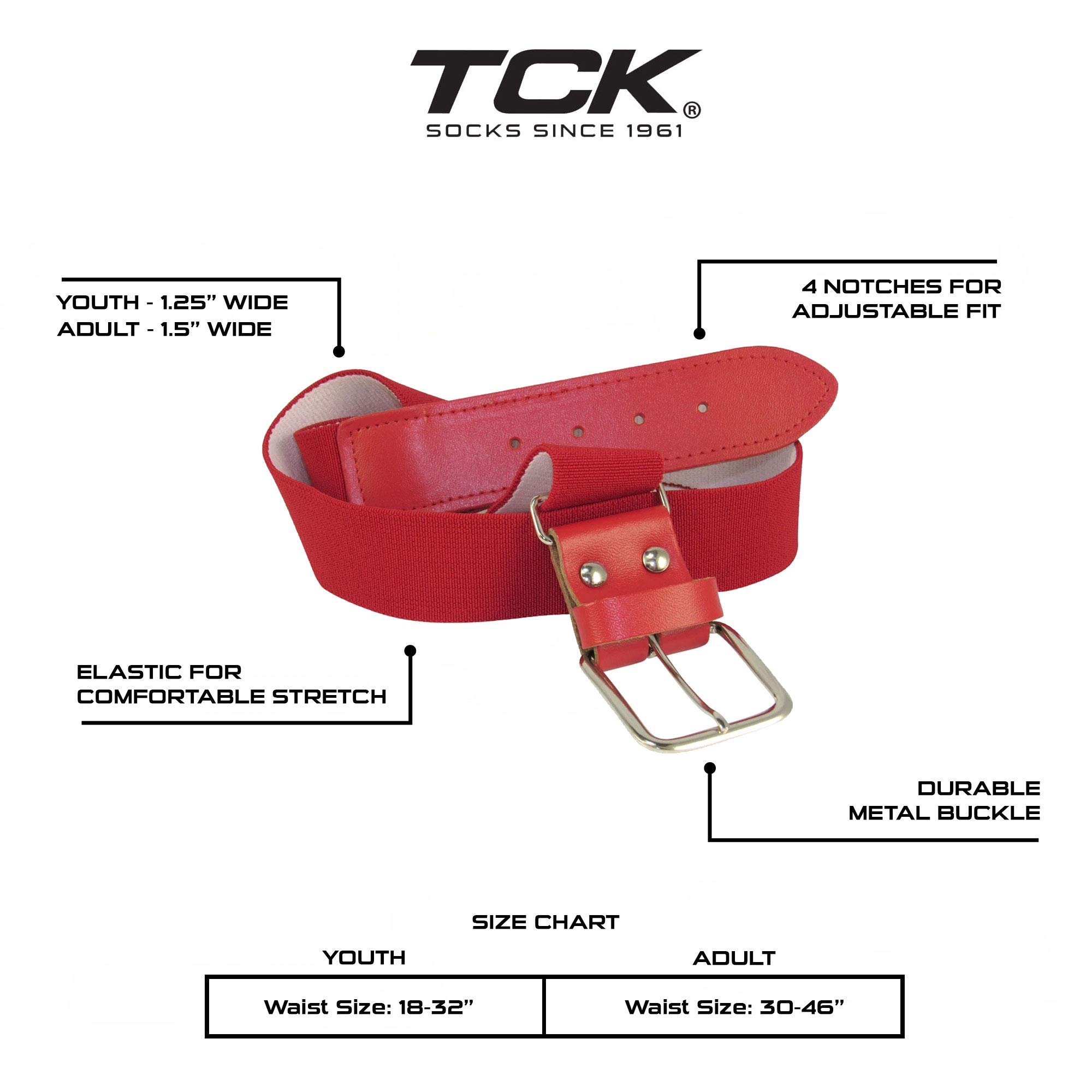Description TCK Softball Baseball Belt in Youth and Adult Sizes. Perfect adjustable Baseball Belt or Softball Belt for youth boys or girls and men or women. Comes in all major team colors.