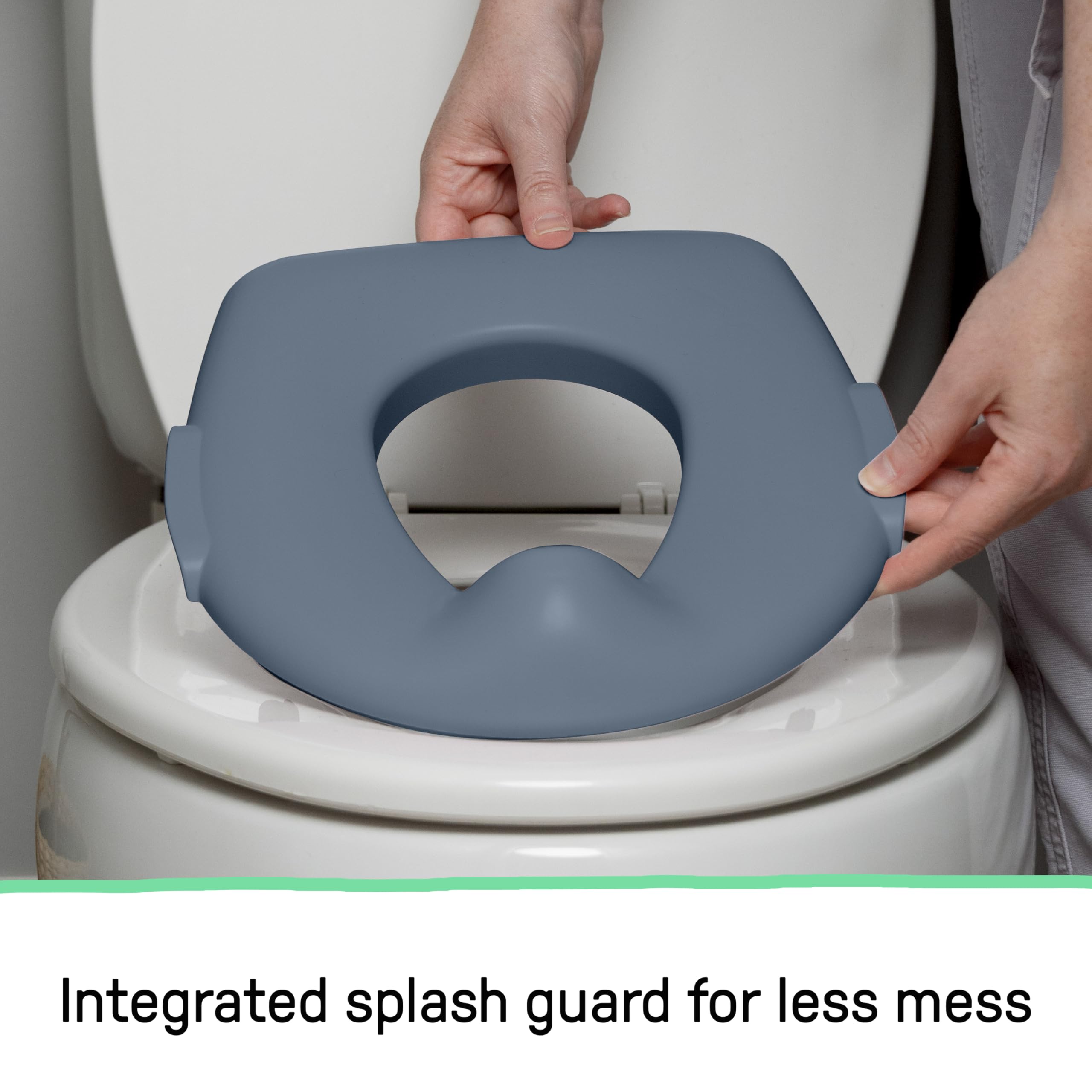 Detachable potty ring fits on a full-size toilet to help child transition to adult toilet; The removable bowl is easy to clean and features a built-in splash guard to keep messy moments contained