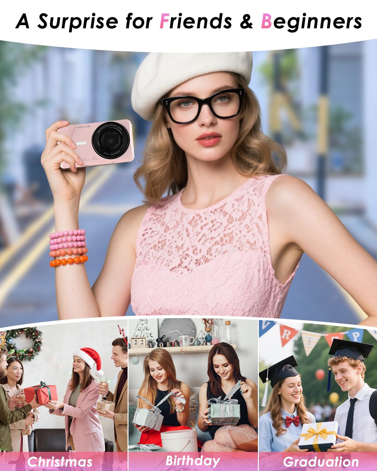 Ultra-Portable & Easy to Use: At just 0.3 lbs (140g), this pocket-sized camera goes anywhere—lightweight and hassle-free. The 2.8" LCD screen with simple one-touch buttons makes it ideal for teens, adult and beginners (no complicated menus!). An ergonomic grip ensures steady one-handed shots while keeping your fingers clear of the lens