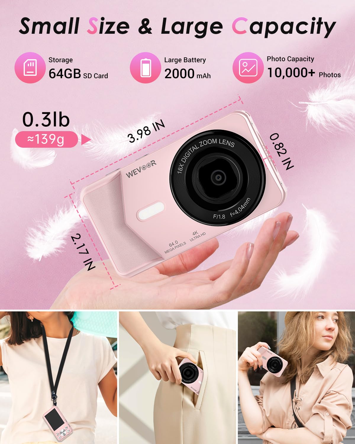 64GB Storage & Extended-Life Travel Companion: Forget battery anxiety and "Storage Full" warnings. Boasting a massive 64GB of built-in storage, the portable camera gives you space for over 10,000 photos or 4+ hours of 4K footage. The high-capacity 2000mAh (well above the industry standard) rechargeable battery keeps you shooting for up to 3 hours straight, so you'll never miss a moment