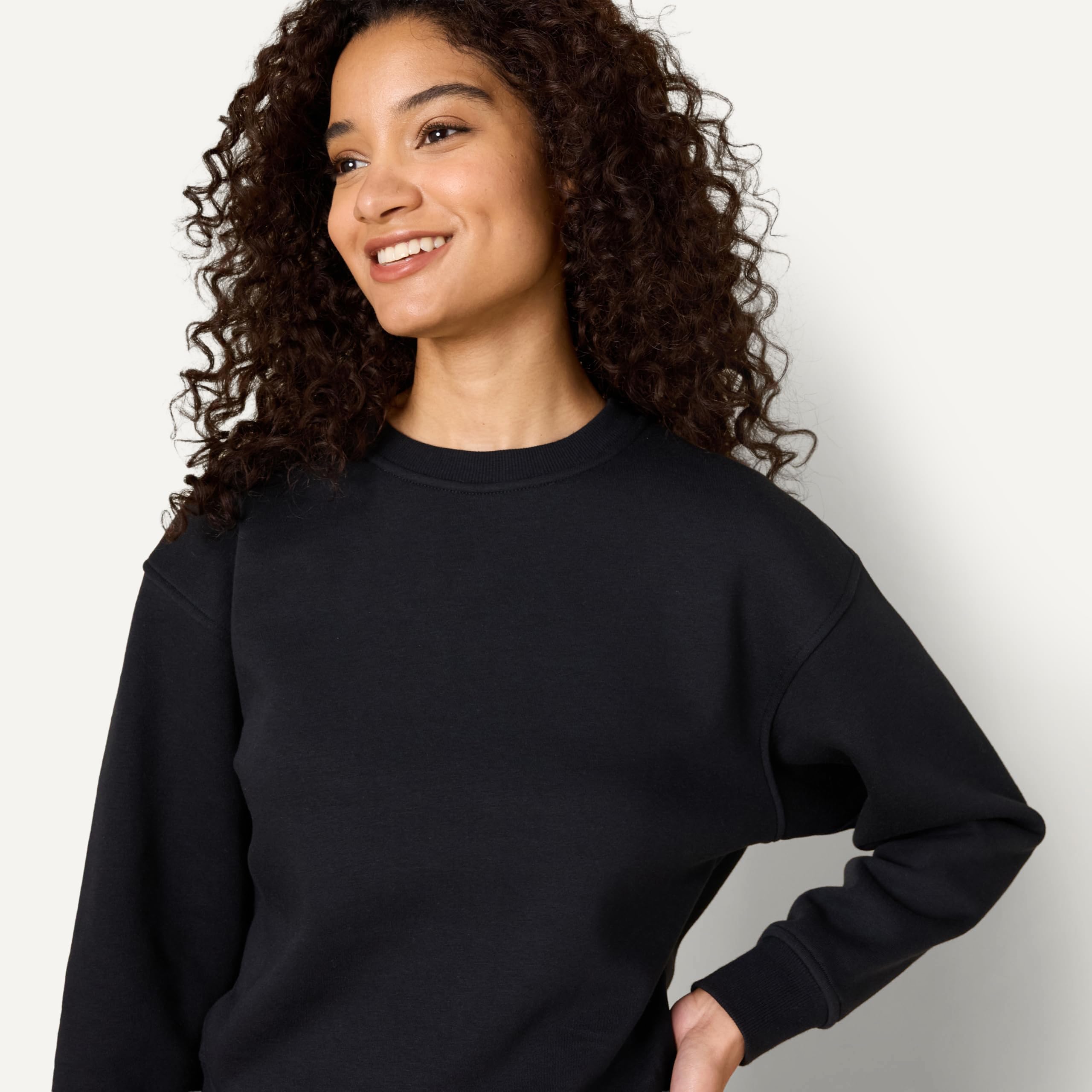 DETAILS: Dropped shoulder boxy fit sweatshirt with soft volume on sleeve, ribbing at neck, cuffs and hem for enhanced stretch and recovery. Perfect for work, travel, weekend wear, or lounging at home