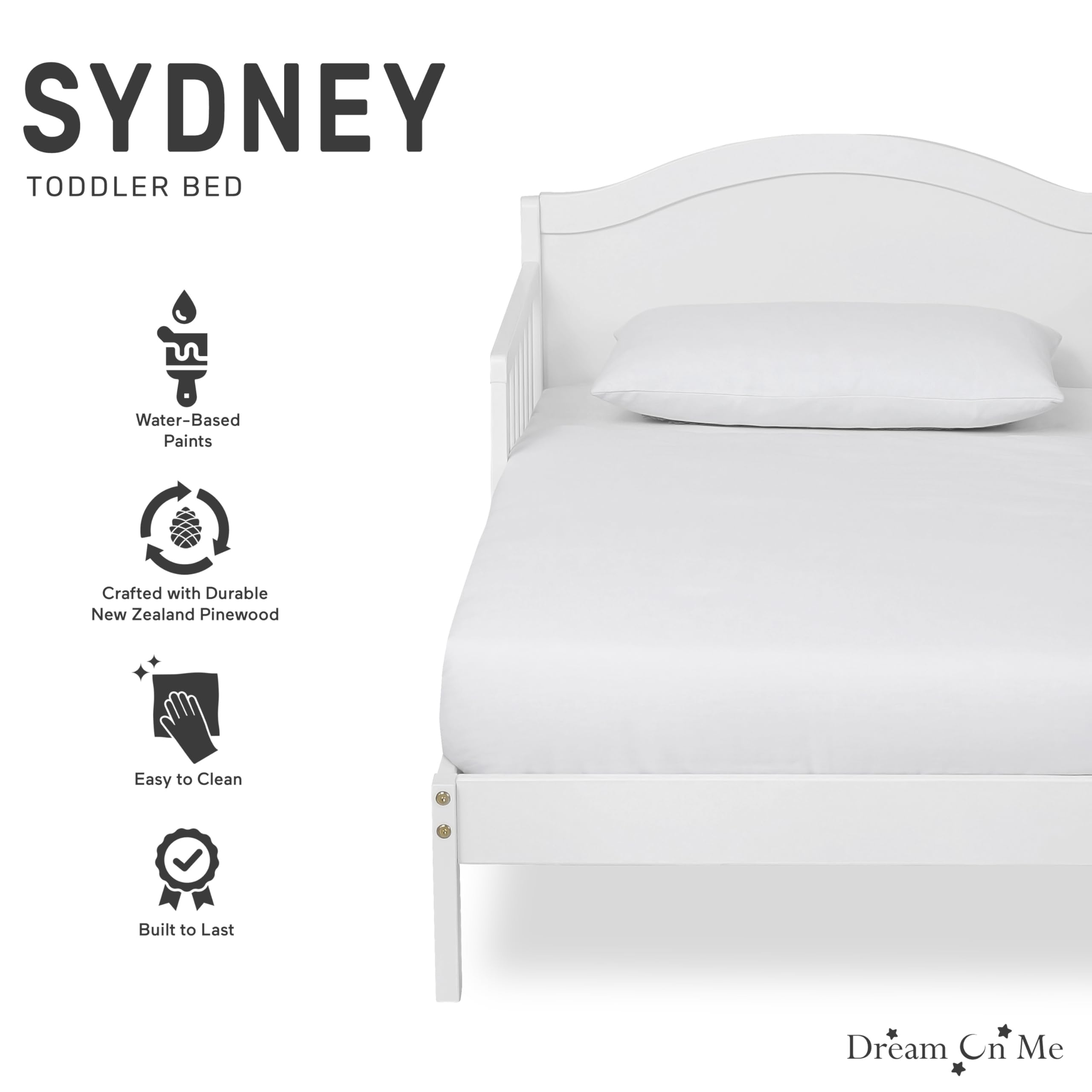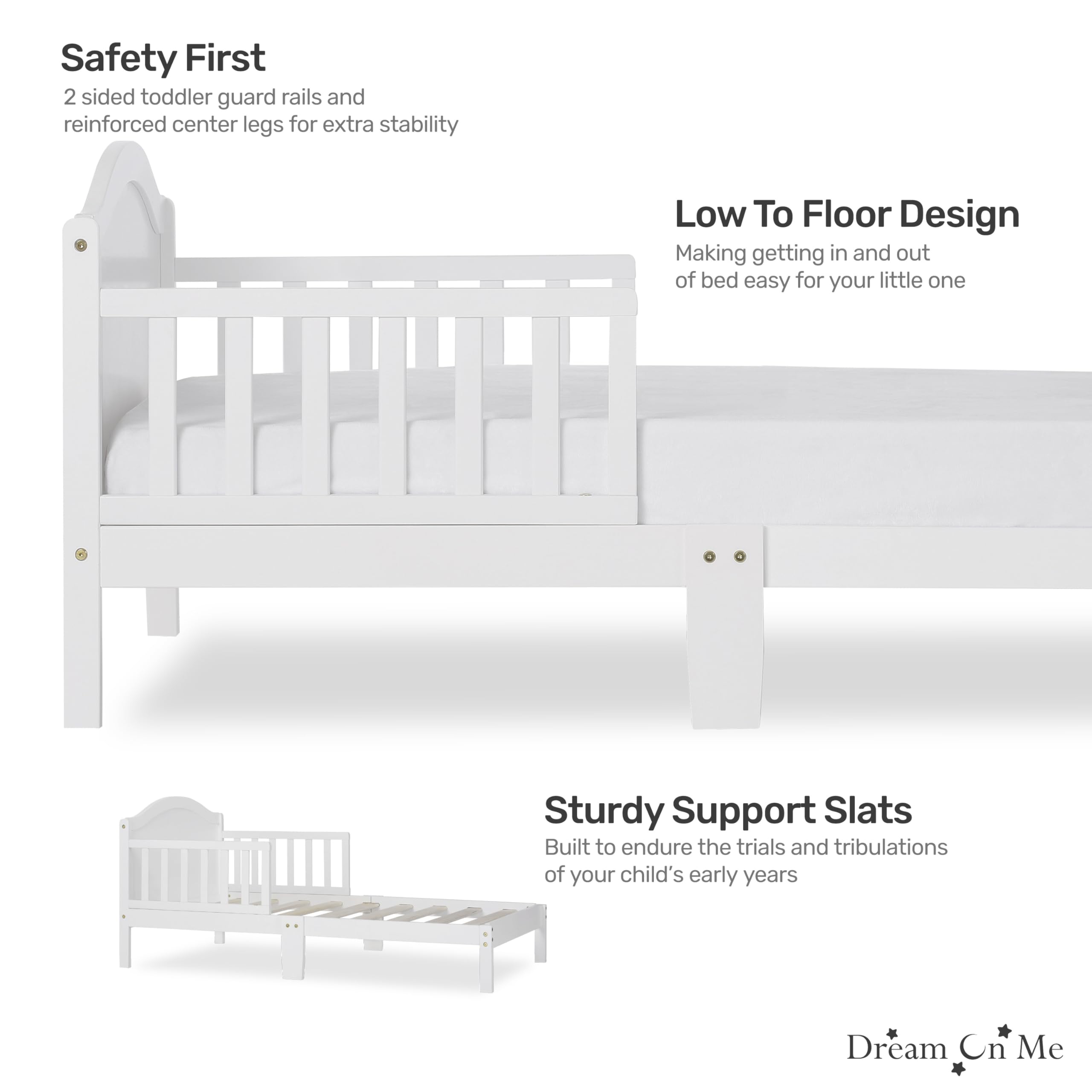 Make the crib-to-toddler transition easy and reassuring with the Dream On Me Sydney Toddler Bed. Sitting low to the floor so little legs can climb in and out confidently, the Sydney includes two side safety rails and center legs for reinforced stability, while sturdy wooden slats provide reliable mattress support. Its chic, modern silhouette with a bell-shaped full panel headboard blends beautifully into any kid’s room, and the elegant, non-toxic finishes complement a wide range of décor. Safety is built in: the Sydney is JPMA certified, meets or exceeds all applicable ASTM and CPSC standards, and is free of phthalates, latex, lead, and BPA. Designed to fit a standard-size crib mattress (for the best fit, pair with a Dream On Me non-toxic, Greenguard certified standard crib mattress), it offers a compact footprint that works in rooms of all sizes. Dimensions: 53" L x 29" W x 28" H; product weight: 19 lbs; maximum weight limit: 50 lbs.