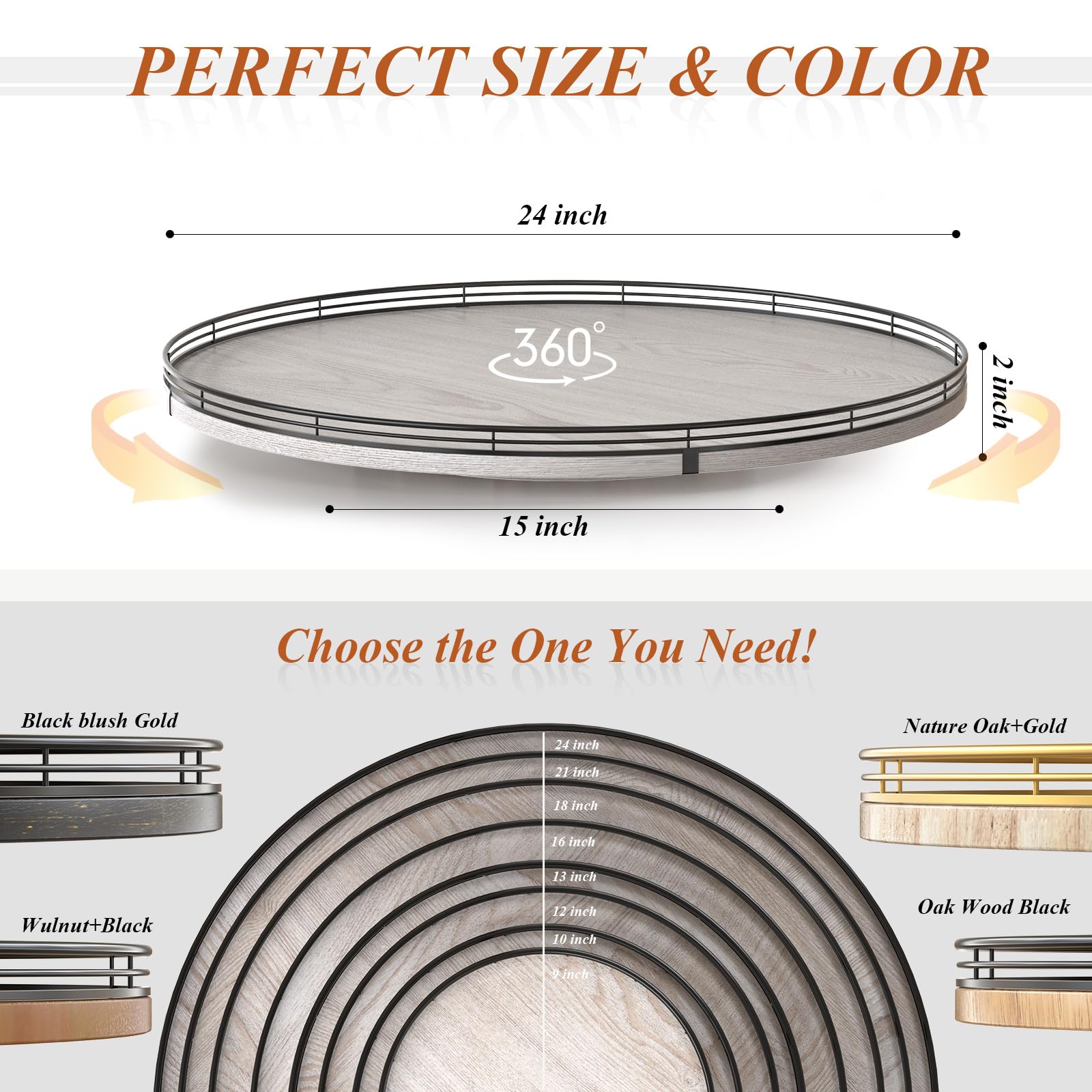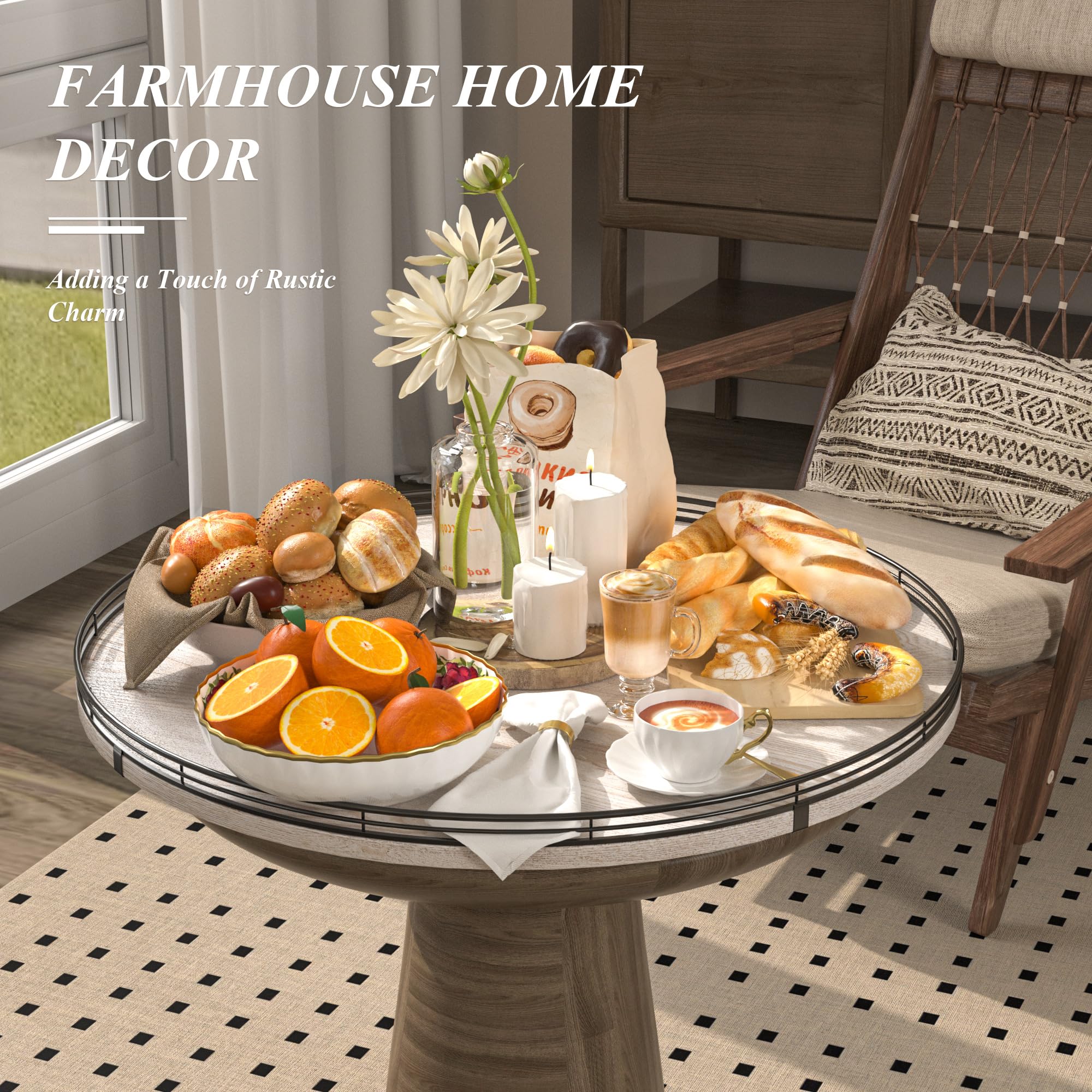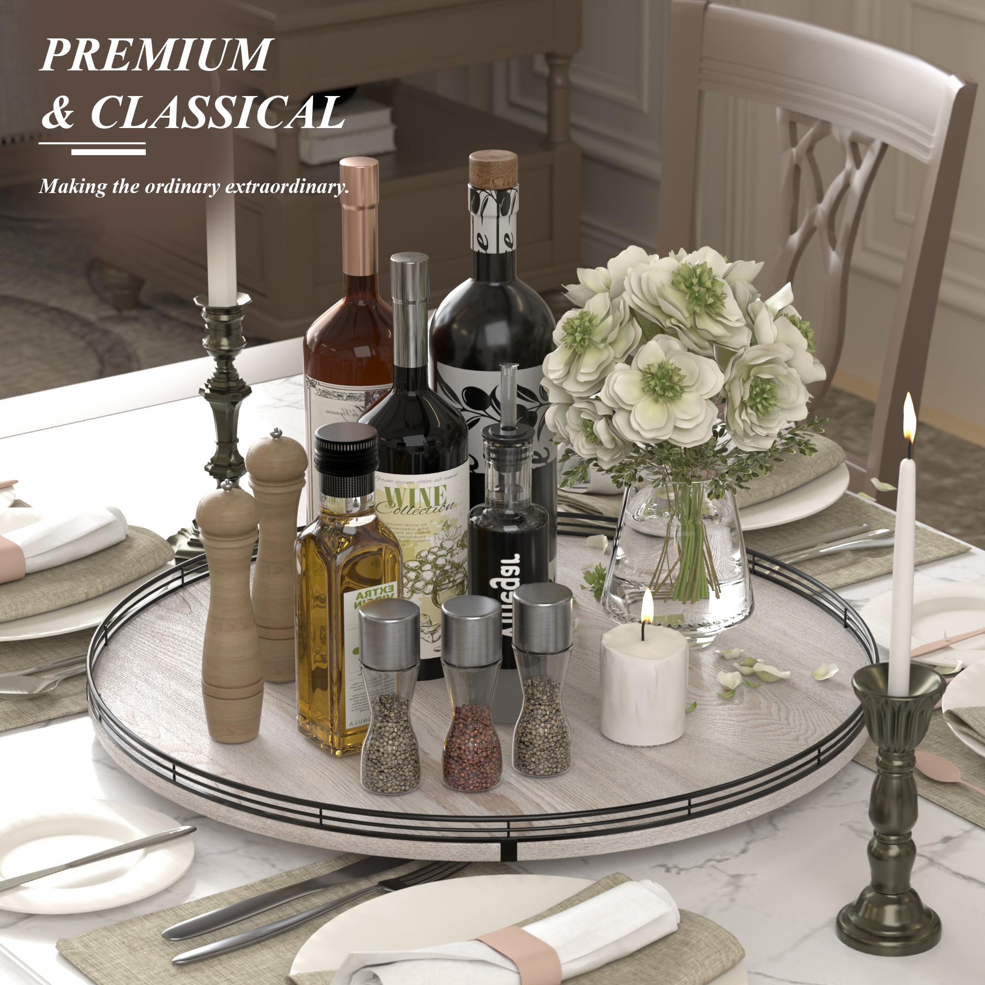 PREMIUM MATERIAL: Our farmhouse large lazy Susan organizer is made of natural wood and strong Iron, sturdy, durable and premium quality. This wooden turntable organizer is a game-changer for keeping your kitchen organized. The farmhouse finish gives it a rustic, charming look that will fit perfectly with your kitchen decor.