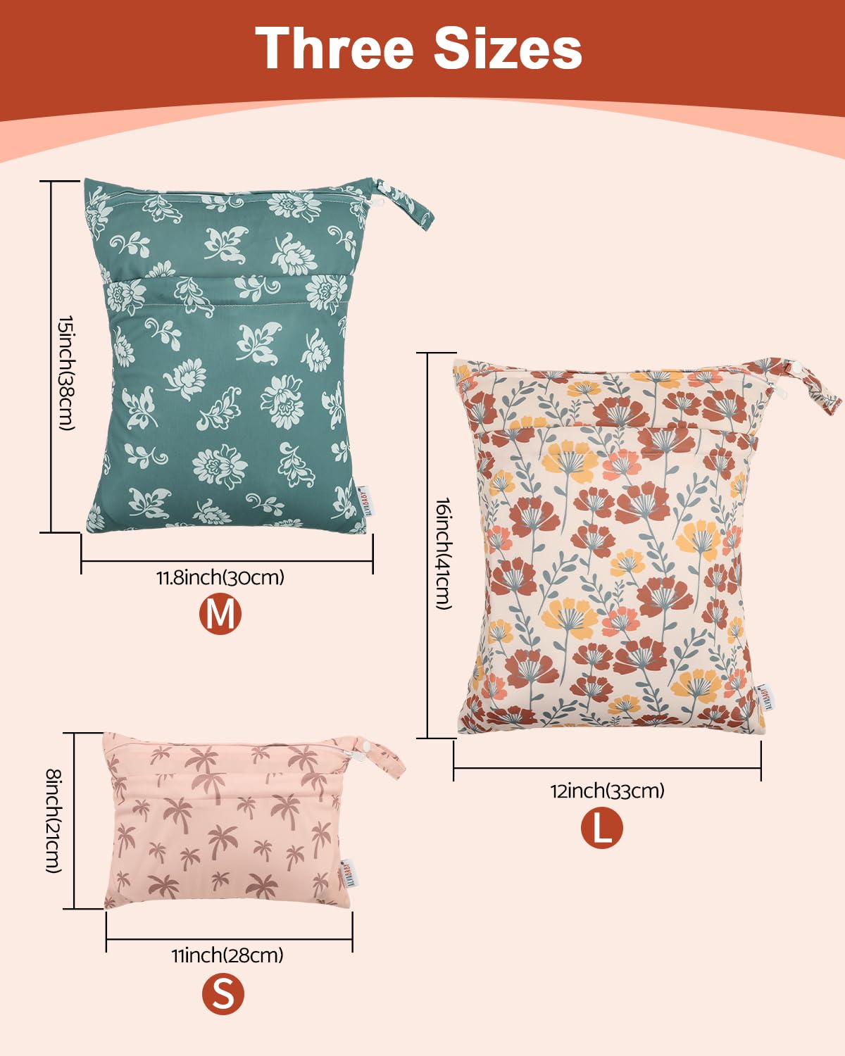Enough Space : Large bag: L16''*W13.3'',can hold up to 10-12 diapers; Medium bag: L14.5''*W11.8'', holds up to 8 diapers; Small bag:L11.5''*W9'',can hold 3-4 diapers. Large and medium bag for baby diaper,swimming suits ,clothes, gym clothes and more. Small bag for your toiletries, bits and undergarment,cosmetics, socks and other belongings.