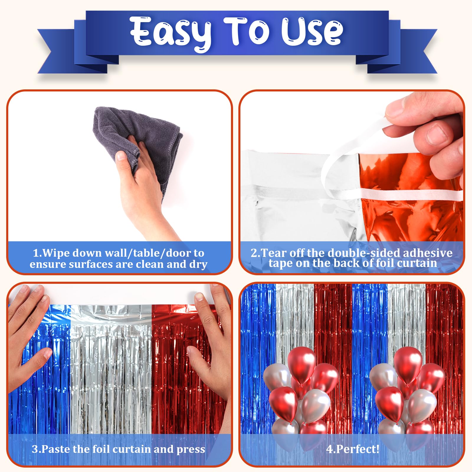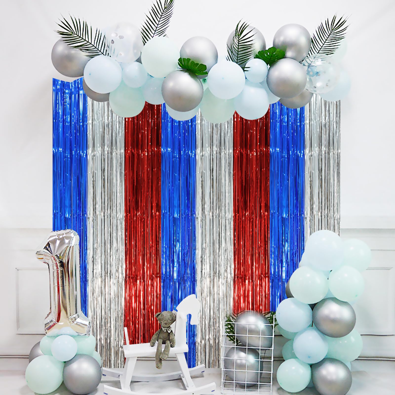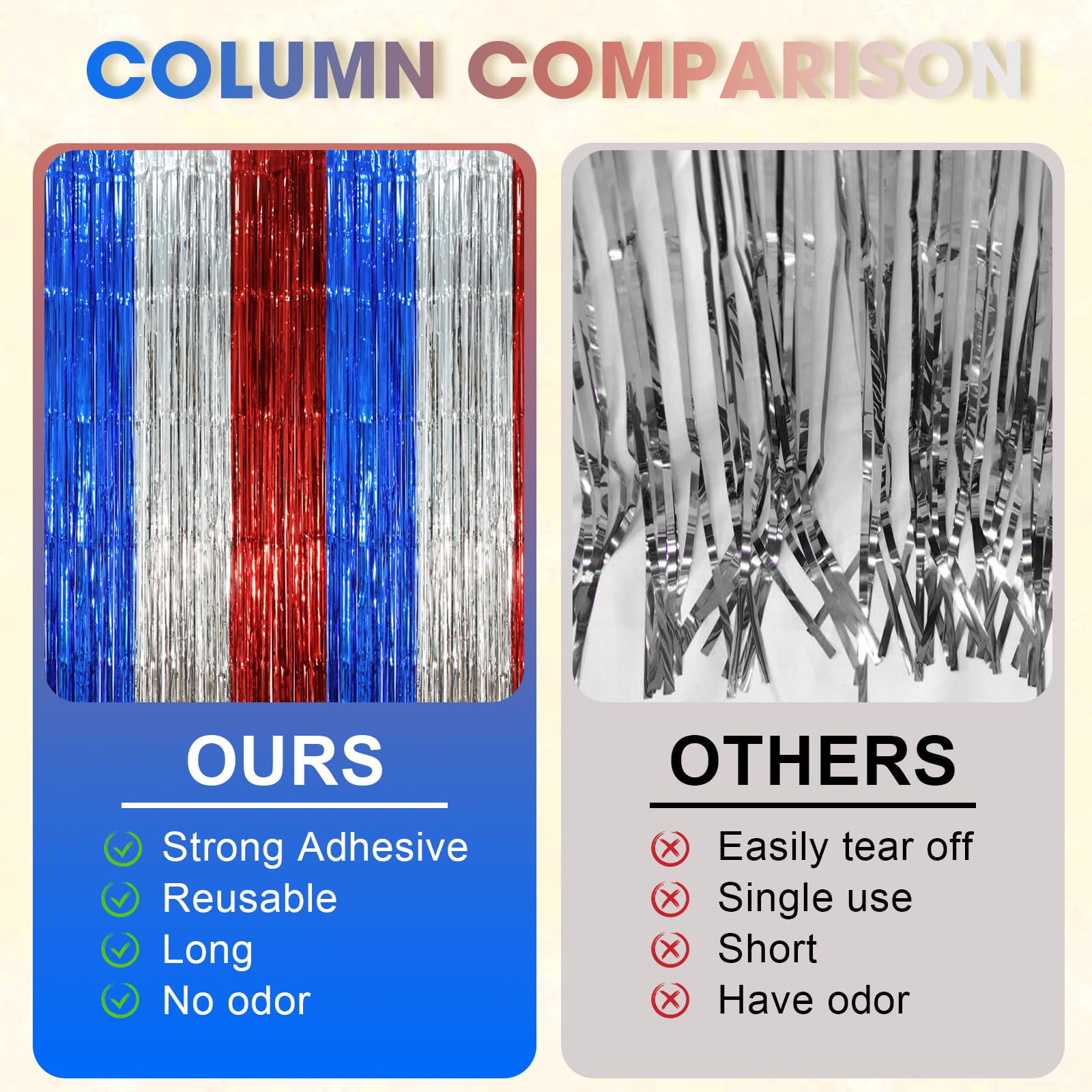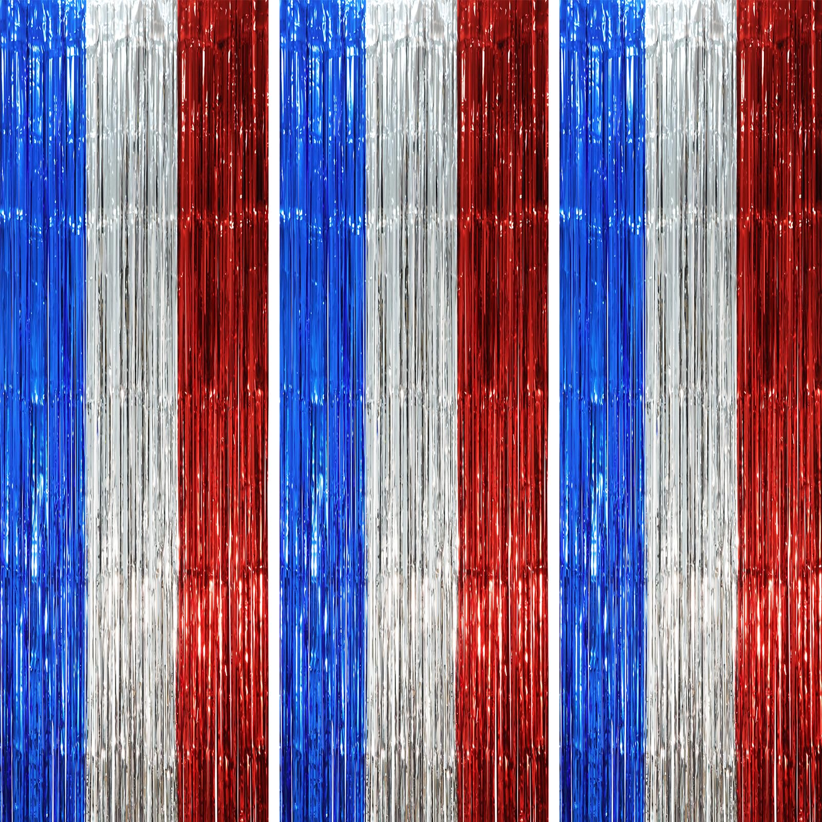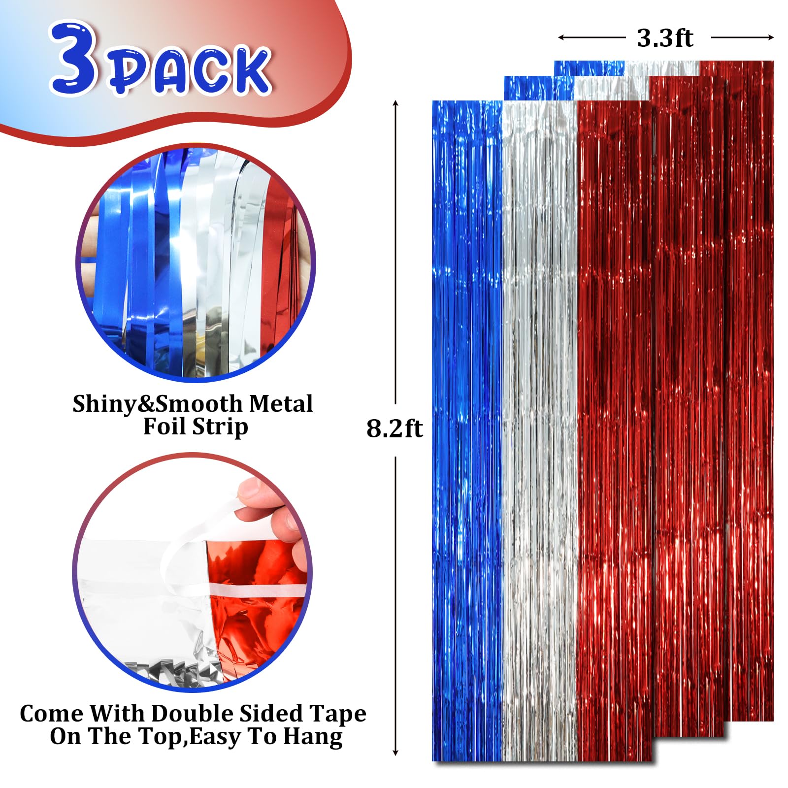 Package Included: 3 packs of blue red and silver foil fringe curtains, the size of the foil curtain is 3.3*8.2ft. It's long enough to fit any occasion