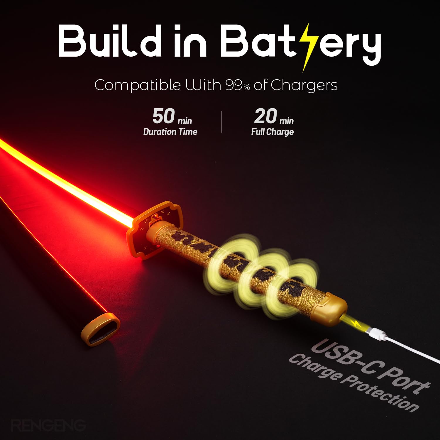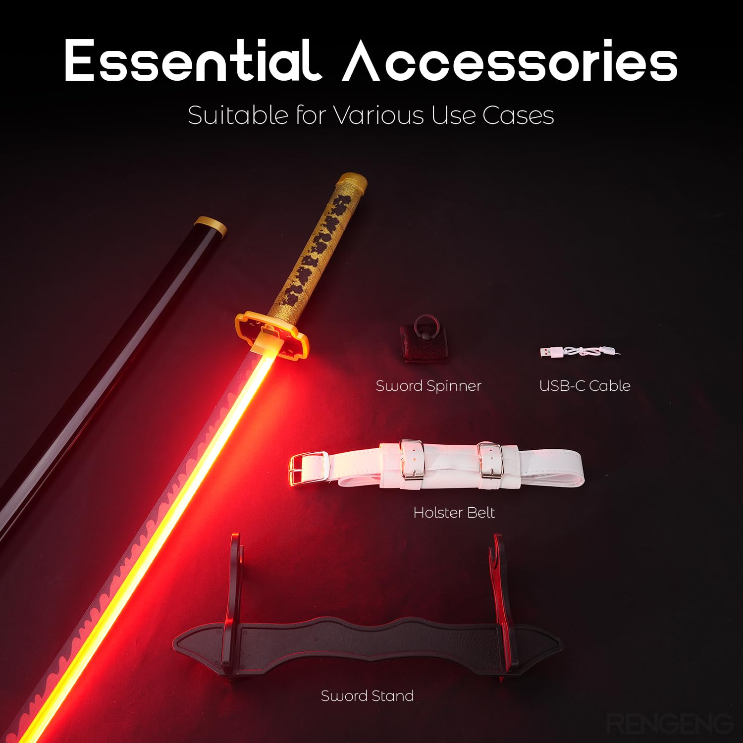 [Packaging Includes] This package contains: Light Up Sword x1, Holster Belt x1, Sword Stand x1, Sword Spinner x1, and USB-C Cable x1