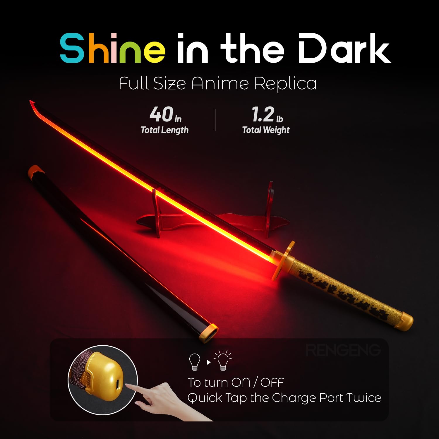 [Rechargeable] The light-up sword is powered by a rechargeable battery that lasts up to 50 minutes on a full charge, which takes about 20 minutes. Turning the light on or off is as simple as tapping the charging port on the handle twice