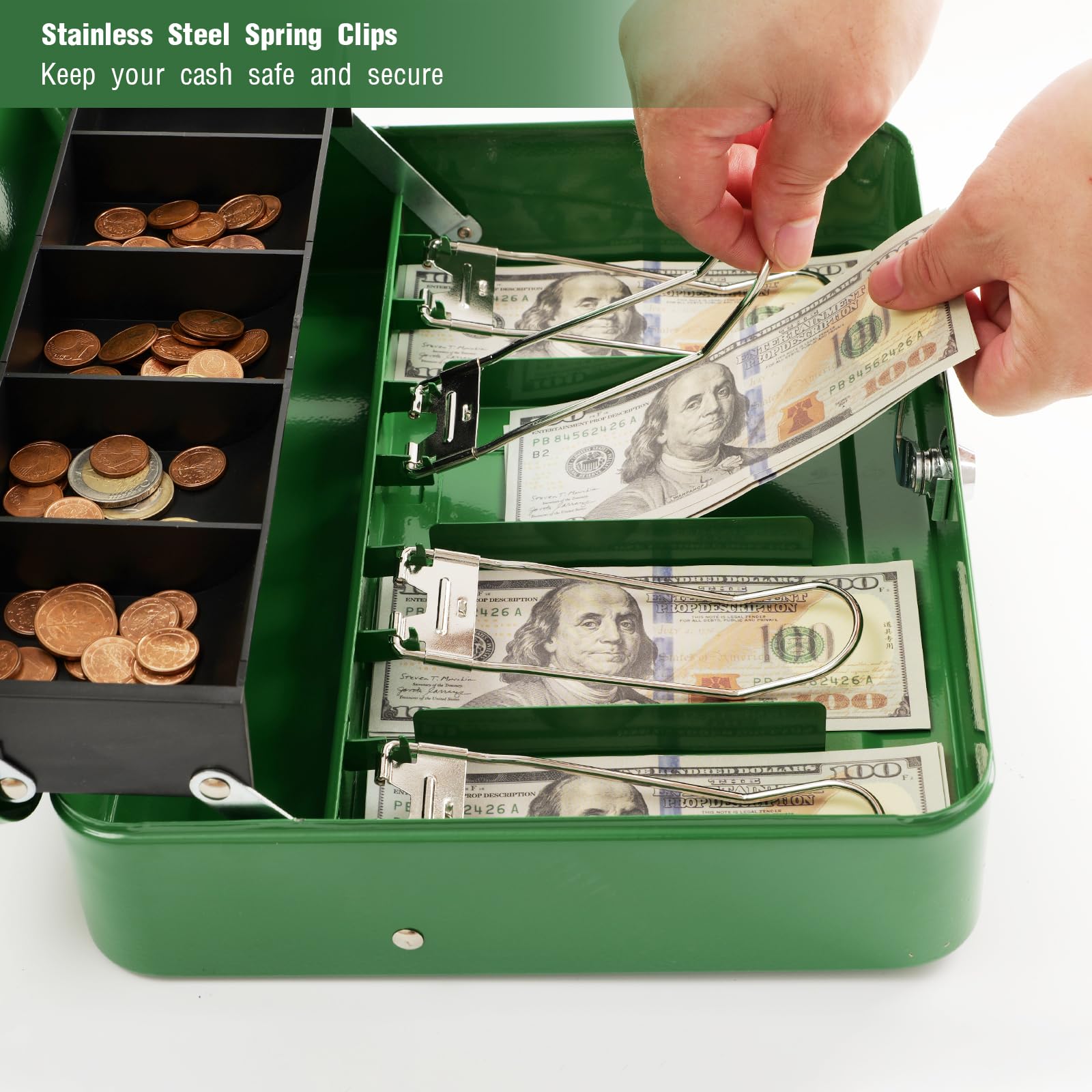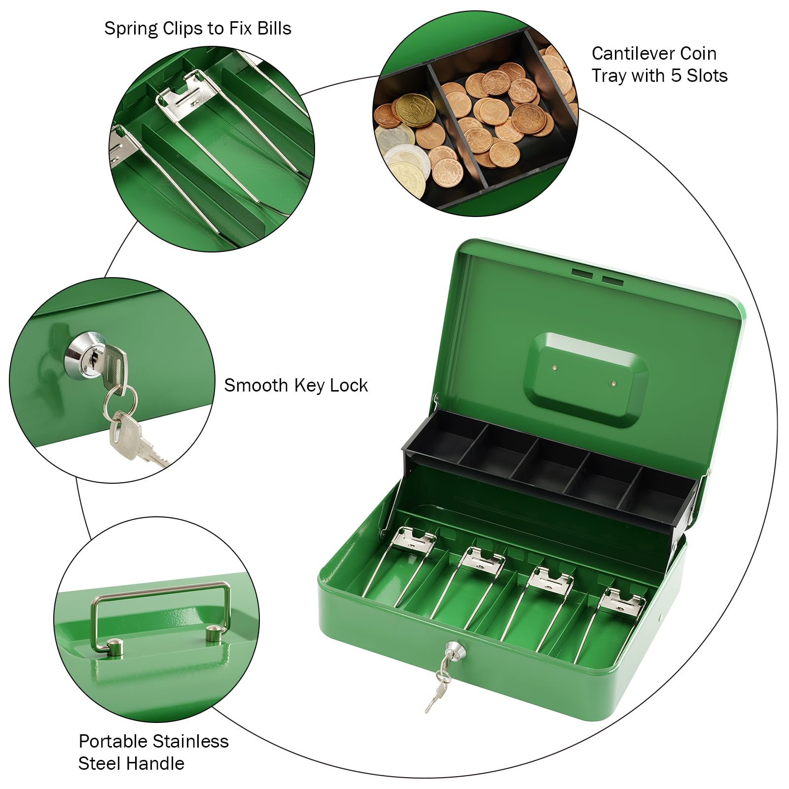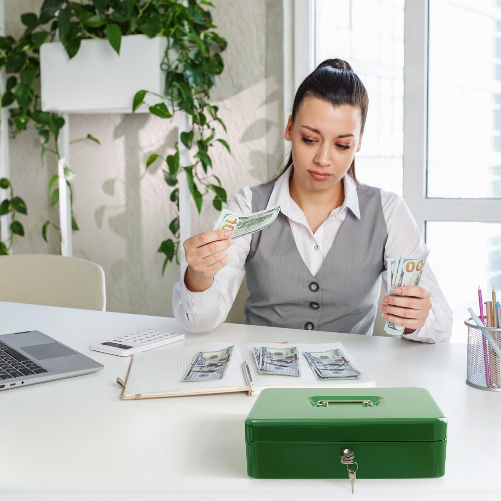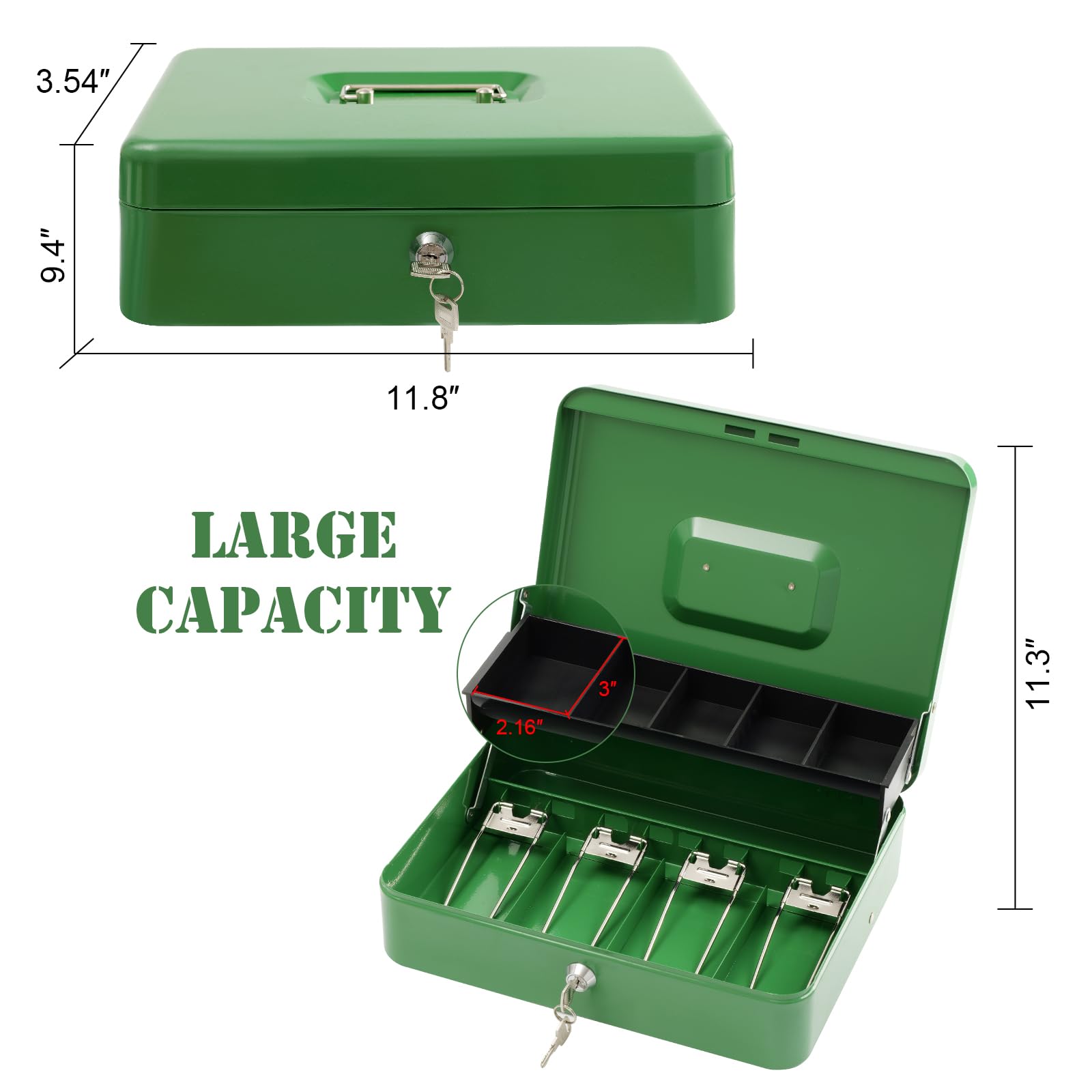 VERSATILE CASH LOCK BOX: Measuring 11.8" x 9.4" x 3.54", our metal cash box with key is ideal for daily cash organization, yard sales, garage sales, craft shows, or use as a money saving box, change box, cash drawer, cash register for small businesses